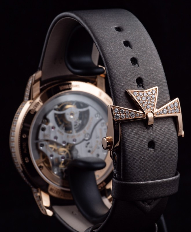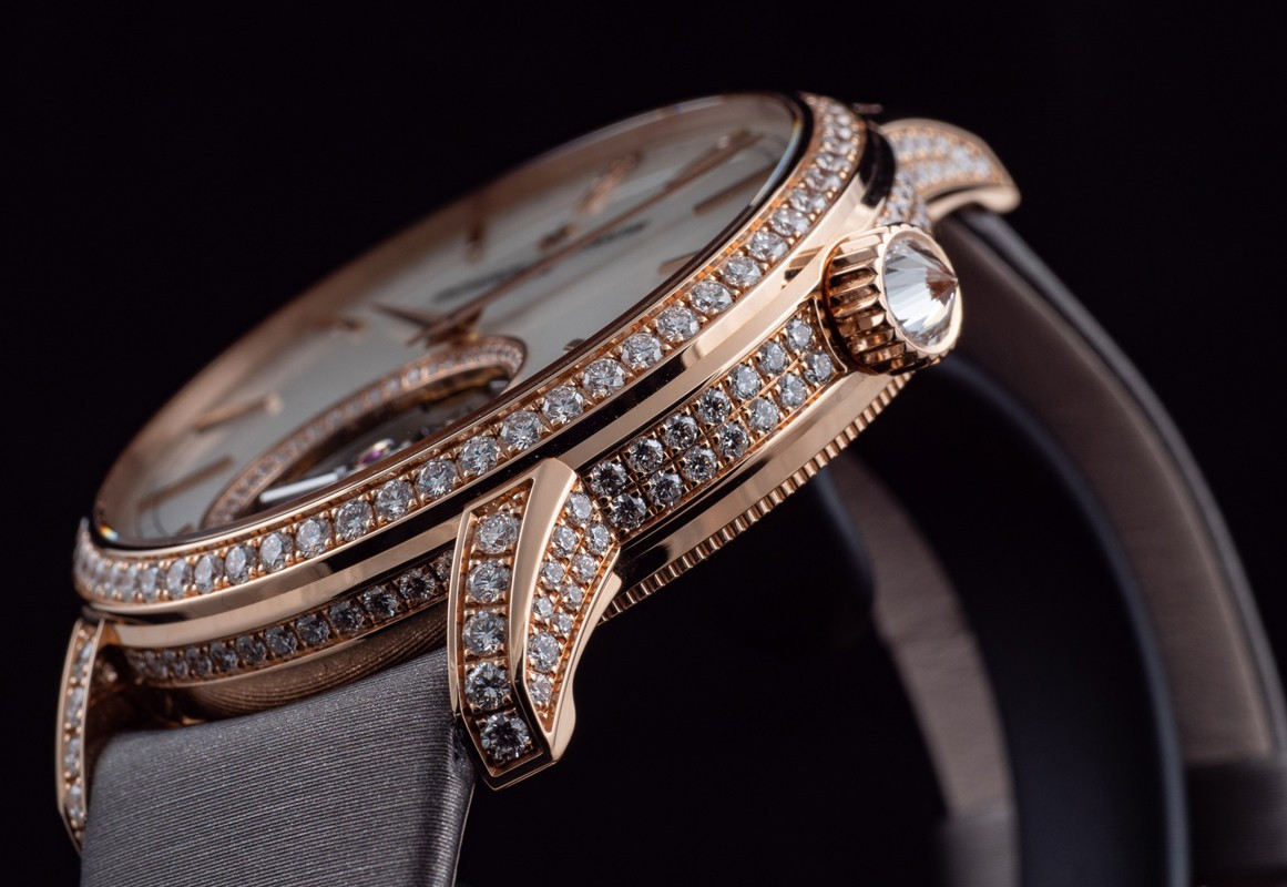 Часы Vacheron Constantin Traditionnelle Tourbillon представлены в корпусе из розового золота 18к размером 39 х 11.22 мм водонепроницаемостью 30 метров. Внутри корпуса находится автоматический механизм, Калибр 2160/1, обладающий запасом хода 80 часов. На белом жемчужном циферблате с белыми бриллиантами отображаются часы, минуты, секунды, турбийон. Часы поставляются на сатиновом ремешке с вставкой из розового золота 18к. Корпус инкрустирован белыми бриллиантами.