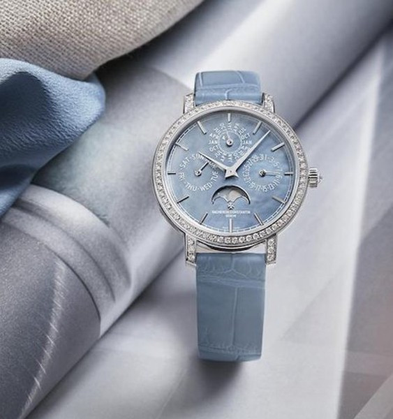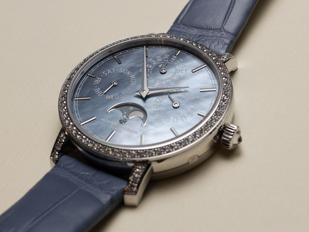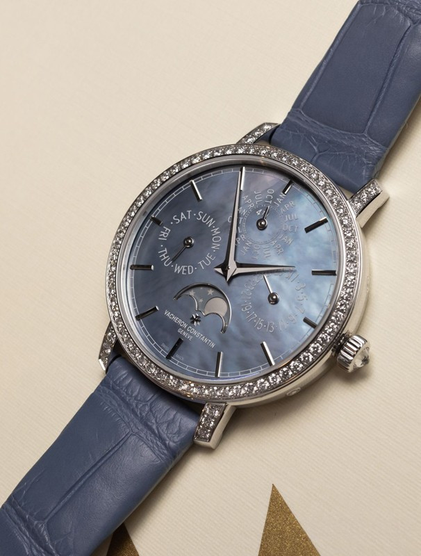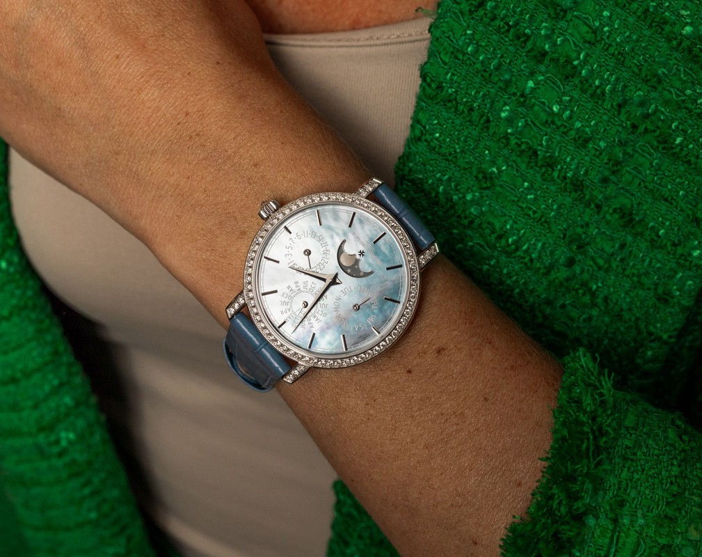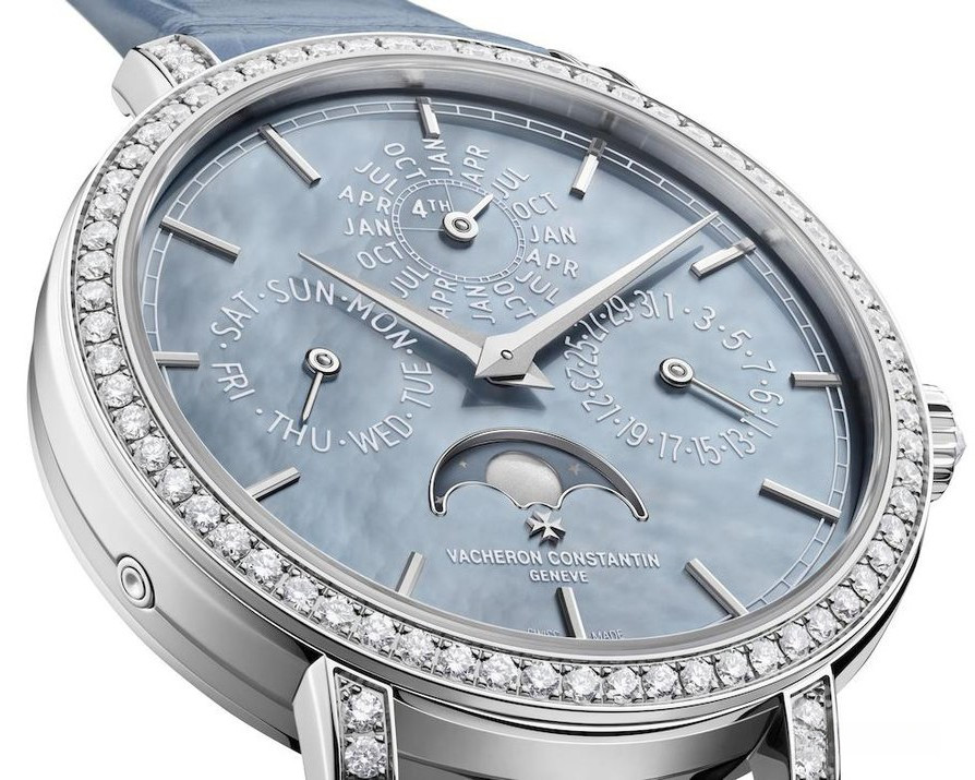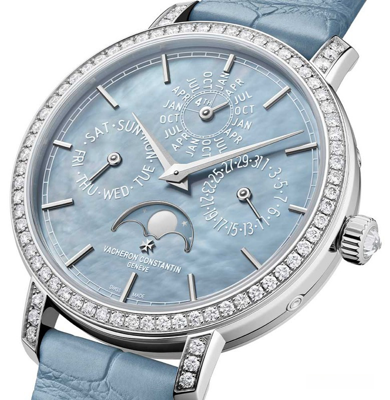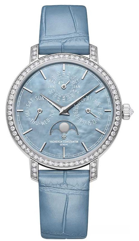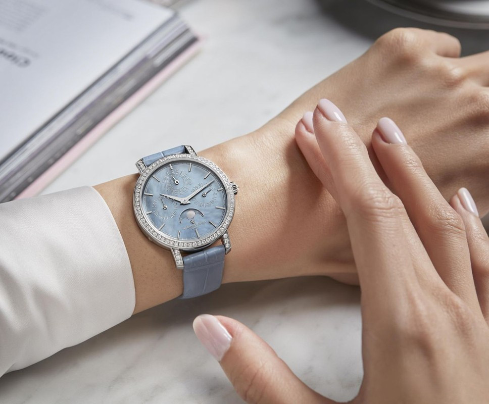 В этой новой ультратонкой модели Traditionnelle с вечным календарем, рассчитанной на женское запястье, установлен мануфактурный калибр 1120 QP толщиной 4,05 мм, высоко ценимый знатоками. Данная модель диаметром 36,5 мм являет прекрасный образец традиций Vacheron Constantin в изготовлении часовых усложнений, интерпретированных в сверхтонких версиях. Ее корпус из белого золота 18 карат демонстрирует все ключевые особенности коллекции Traditionnelle в сочетании с тщательной ручной отделкой. Украшенный драгоценными камнями безель и переливающийся перламутровый циферблат продуманы таким образом, чтобы обеспечить максимально удобную читаемость календарных показаний.