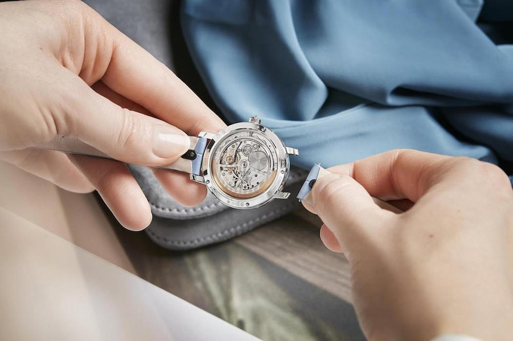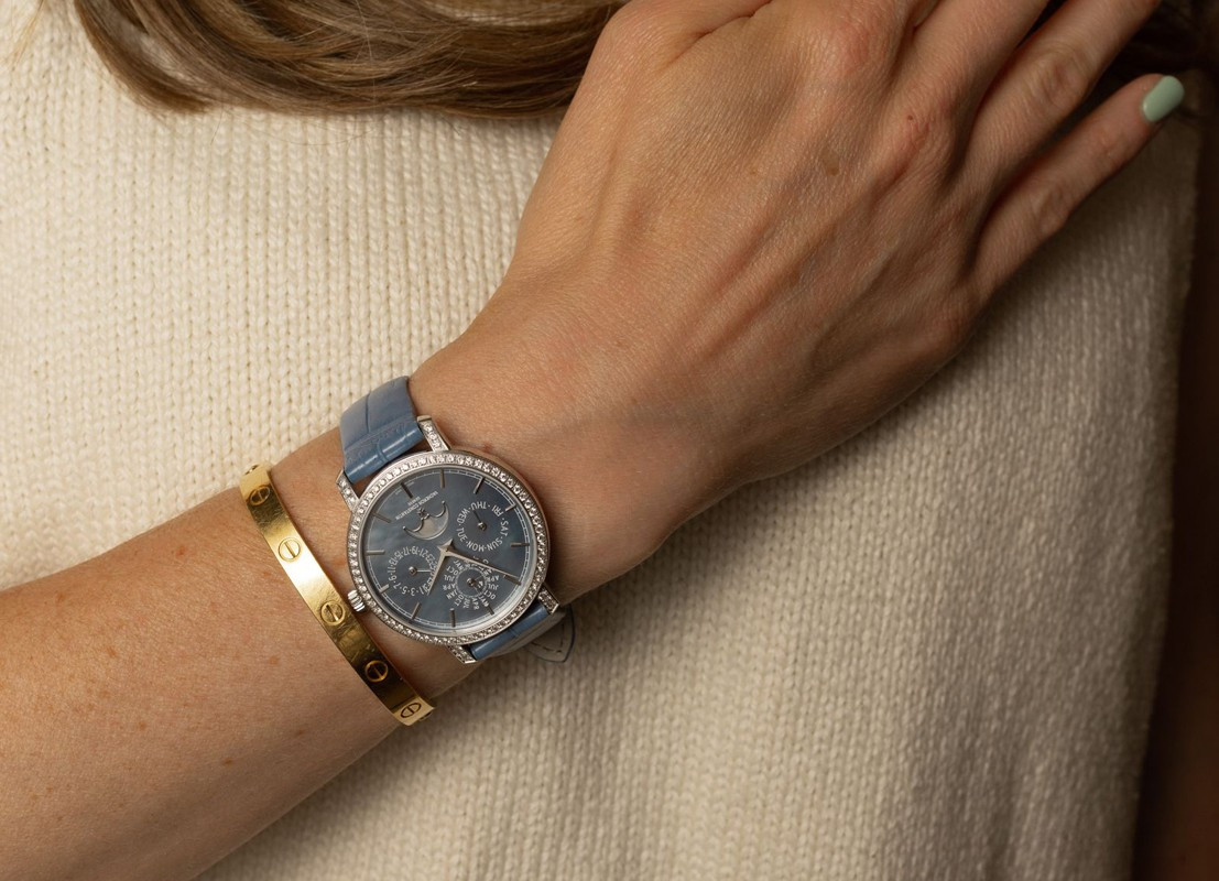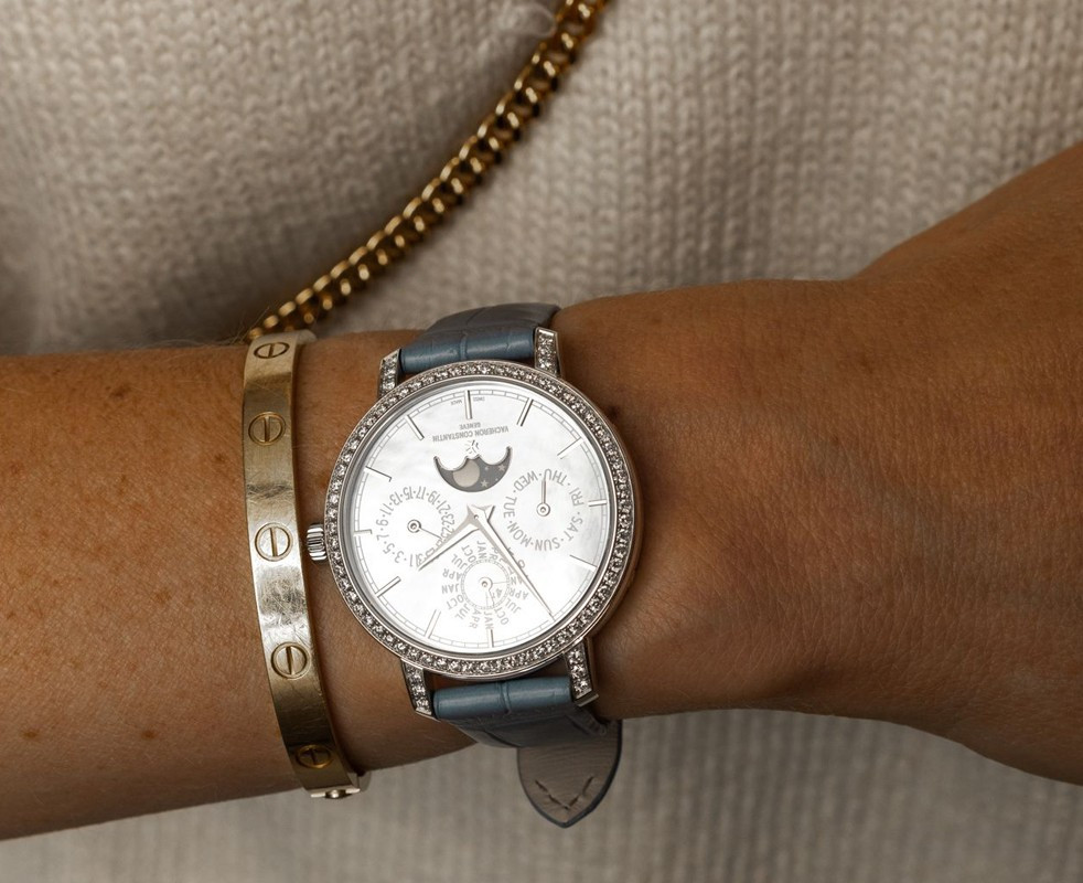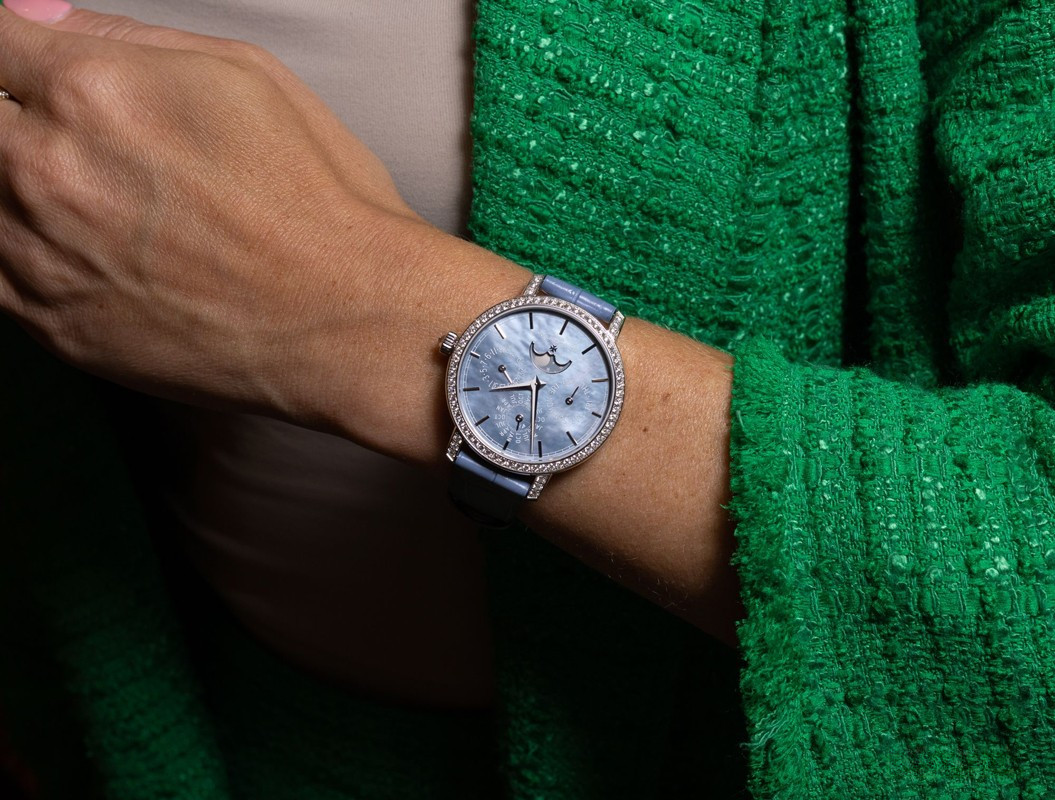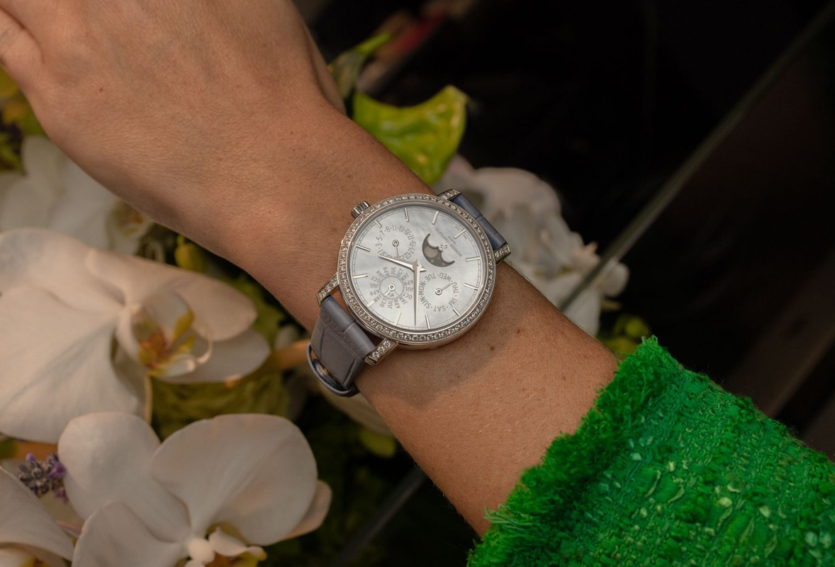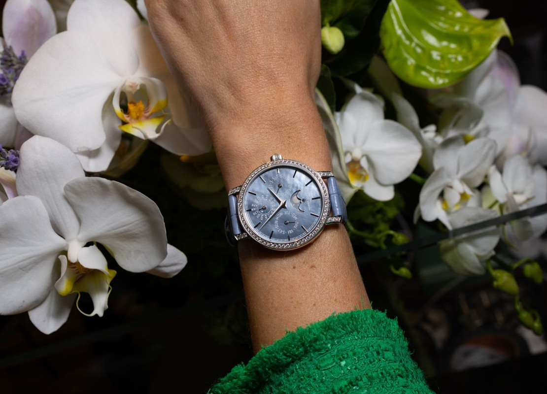 В этой новой ультратонкой модели Traditionnelle с вечным календарем, рассчитанной на женское запястье, установлен мануфактурный калибр 1120 QP толщиной 4,05 мм, высоко ценимый знатоками. Данная модель диаметром 36,5 мм являет прекрасный образец традиций Vacheron Constantin в изготовлении часовых усложнений, интерпретированных в сверхтонких версиях. Ее корпус из белого золота 18 карат демонстрирует все ключевые особенности коллекции Traditionnelle в сочетании с тщательной ручной отделкой. Украшенный драгоценными камнями безель и переливающийся перламутровый циферблат продуманы таким образом, чтобы обеспечить максимально удобную читаемость календарных показаний.