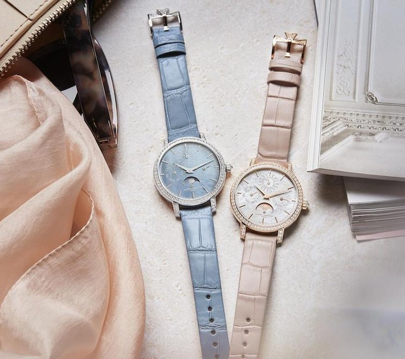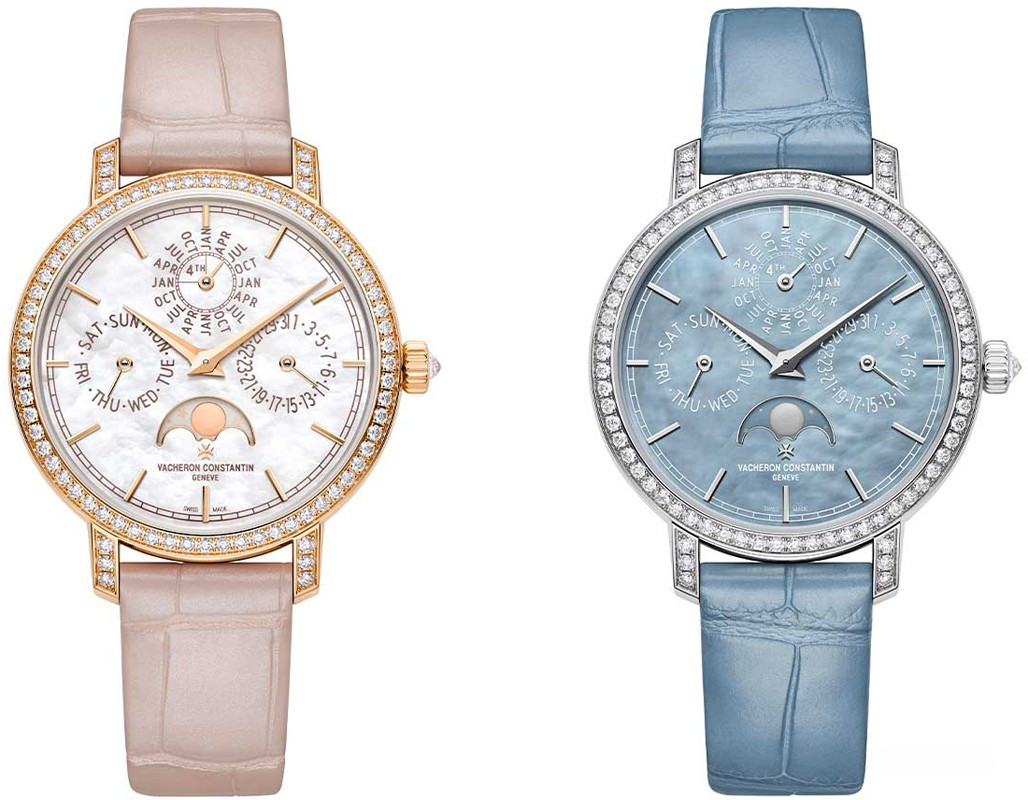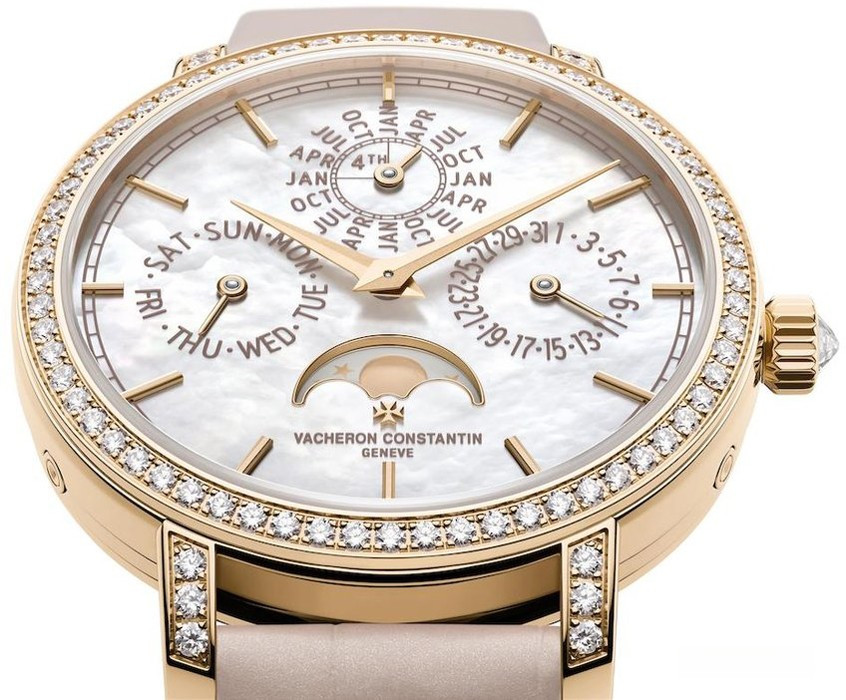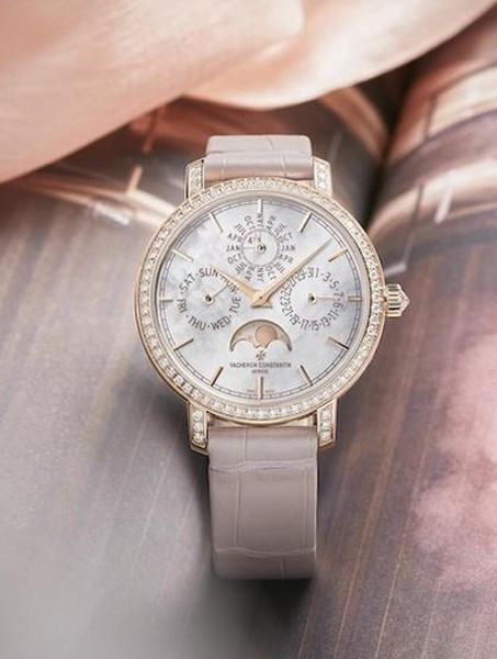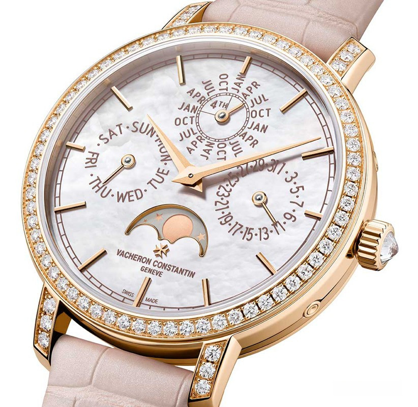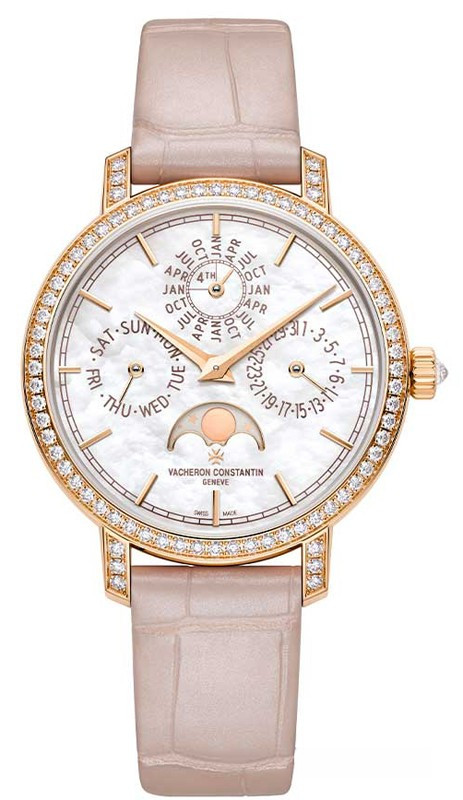 В этой новой ультратонкой модели Traditionnelle с вечным календарем, рассчитанной на женское запястье, установлен мануфактурный калибр 1120 QP толщиной 4,05 мм, высоко ценимый знатоками. Данная модель диаметром 36,5 мм являет прекрасный образец традиций Vacheron Constantin в изготовлении часовых усложнений, интерпретированных в сверхтонких версиях. Ее корпус из розового золота 18 карат демонстрирует все ключевые особенности коллекции Traditionnelle в сочетании с тщательной ручной отделкой. Украшенный драгоценными камнями безель и переливающийся перламутровый циферблат продуманы таким образом, чтобы обеспечить максимально удобную читаемость календарных показаний.