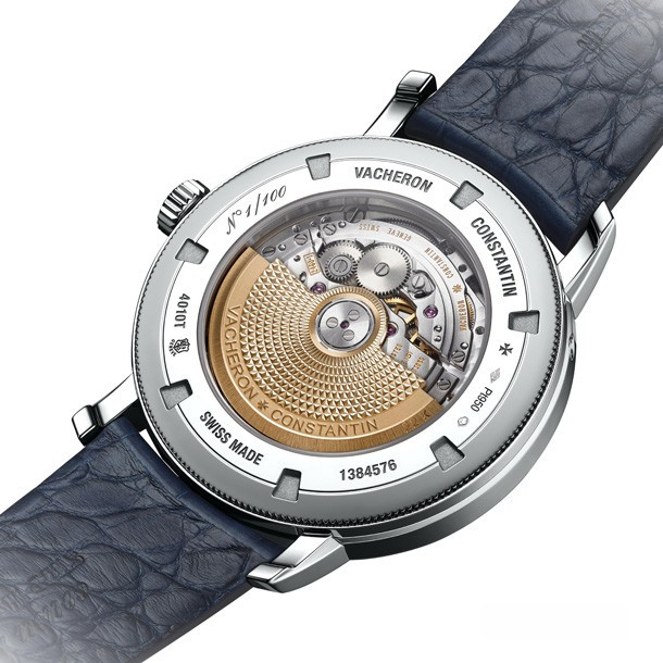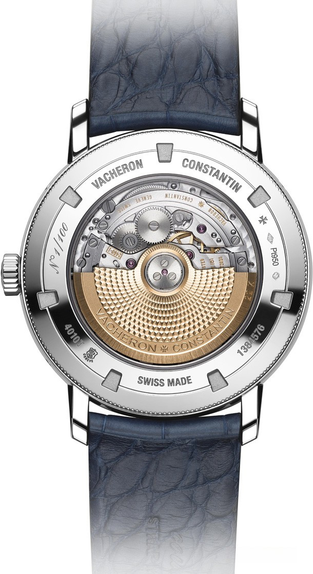 Современное выражение великой Женевской часовой традиции передано через палитру часовых усложнений в классическом дизайне. Чистый циферблат, украшенный золотыми двугранными стрелками и часовыми маркерами, идеально сочетается с синими арабскими цифрами, украшающими дату и другие индикаторы календаря. Платиновый лунный диск делает акцент на уникальной природе этой модели. Визуальное равновесие и разборчивость циферблата подчеркиваются необычным расположением апертур для отображения дня и месяца. Дата обозначается тонкой синей центральной стрелкой. Водонепроницаемость корпуса составляет 30 метров, диаметр – 41 мм. Автоматический механизм часов Traditionnelle Collection Excellence Platine вмещает 308 компонентов. Калибр 2460 QCL олностью разработан и изготовлен на мануфактуре Vacheron Constantin. Оснащенный ротором из 22-каратного золота, механизм имеет балансовую частоту 4 Гц и обеспечивает 40-часовой запас хода. На платиновом циферблате отображаются часы, минуты и секунды, полный календарь (день недели, дата и месяц), фаза и возраст Луны. Коррекция индикатора фазы Луны требуется только один раз в 122 года. Эти исключительные платиновые часы, выпущенные ограниченной серией 100 экземпляров, снабжены темно-синим ремешком из кожи аллигатора, сшитого вручную платиново-шелковой нитью. В качестве застежки используются платиновые полированные половинки мальтийского креста.