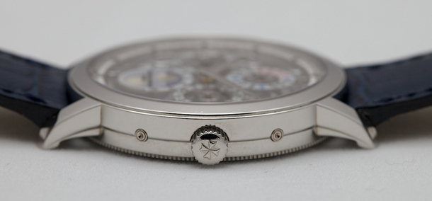 Астрономические часы скелетон Vacheron Constantin Patrimony Traditionnelle Skeleton Perpetual Calendar 43172/000P-9236 с вечным календарем выпущены в круглом корпусе из платины. Размер составляет 39 мм, водонепроницаемость 30 м. Внутри корпуса установлен автоматический механизм, Калибр 1120 QP SQ, обеспечивающий запас хода 40 часов. На серебристом циферблате отображаются часы, минуты, дата, день недели, месяц, фаза луны, цикл високосного года. Часы комплектуются ремешком из кожи аллигатора с платиновой вставкой.