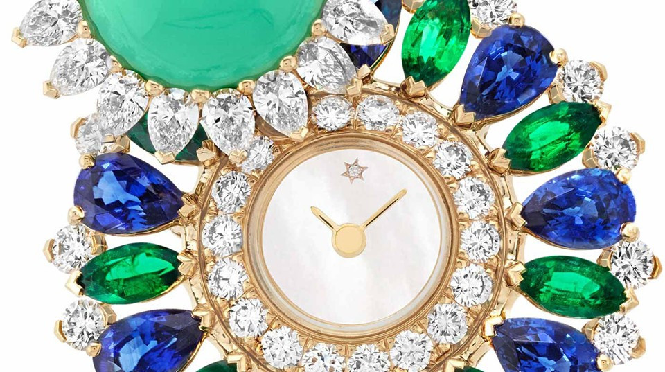 водонепроницаемость 30 м, корпус инкрустирован белыми бриллиантами, сапфирами и изумрудами