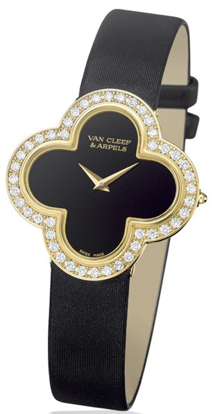 Часы из коллекции Alhambra обладают вневременной элегантостью. Они изготовлены в знаковых мотивах модного дома. Часы сверкают своими гранями на запястье. На циферблате из черного оникса расположены центральные часовая и минутная стрелки. Безель часов инкрустирован бриллиантами. Часы поставляются на черном атласном ремешке с застежкой из желтого золота 18к. Корпус диаметром 29.3 мм изготовлен из желтого золота 18к и обладает водонерпоницаемостью до 30 метров. Внутри корпуса заключен швейцарский кварцевый механизм.