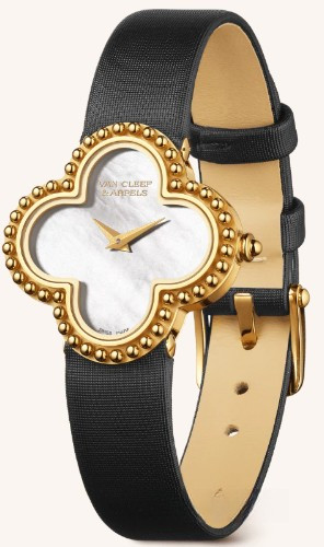 Мотив Alhambra® – настоящий символ удачи, созданный в 1968 году. В новой часовой коллекции он предстает в исполнении ярких комбинаций материалов, цветов и видов огранки, подобно ювелирным украшениям. Часы Alhambra, маленькая модель. Корпус из желтого золота 26 x 26 мм; безель из желтого золота; циферблат из белого перламутра; заводная головка из желтого золота; черный атласный ремешок, классическая застежка из желтого золота; кварцевый механизм.