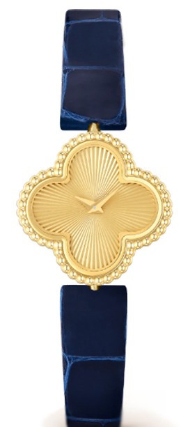 Мотив Alhambra® – настоящий символ удачи, созданный в 1968 году. В новой часовой коллекции он предстает в исполнении ярких комбинаций материалов, цветов и видов огранки, подобно ювелирным украшениям. Часы Sweet Alhambra. Корпус из желтого золота 22,7 x 22,7 мм; безель из желтого золота; циферблат из гильошированного желтого золота; сменный синий ремешок из блестящей кожи аллигатора с логотипом VCA; сменная классическая застежка из желтого золота; кварцевый механизм. Часы продаются с двумя сменными ремешками и одной сменной классической застежкой.