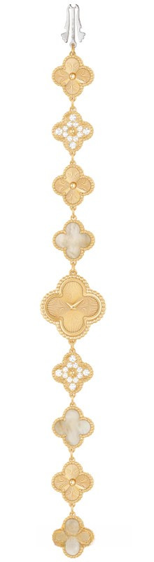 Мотив Alhambra® – настоящий символ удачи, созданный в 1968 году. В новой часовой коллекции он предстает в исполнении ярких комбинаций материалов, цветов и видов огранки, подобно ювелирным украшениям. Часы Sweet Alhambra. Корпус из желтого золота 22,7 x 22,7 мм; безель из желтого золота; циферблат из гильошированного желтого золота; браслет из желтого золота с бриллиантами круглой огранки и золотистым перламутром; бриллианты цвета DEF, чистоты – от IF до VVS; кварцевый механизм
