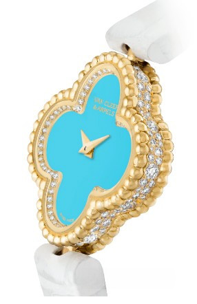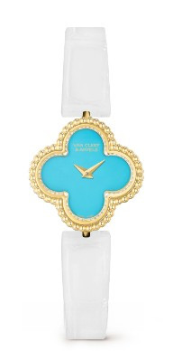 Мотив Alhambra® – настоящий символ удачи, созданный в 1968 году. В новой часовой коллекции он предстает в исполнении ярких комбинаций материалов, цветов и видов огранки, подобно ювелирным украшениям. Часы Sweet Alhambra. Корпус из желтого золота 22,7 x 22,7 мм; безель из желтого золота; циферблат из бирюзы с белыми бриллиантами; ремешок из кожи аллигатора с золотой застежкой; кварцевый механизм.