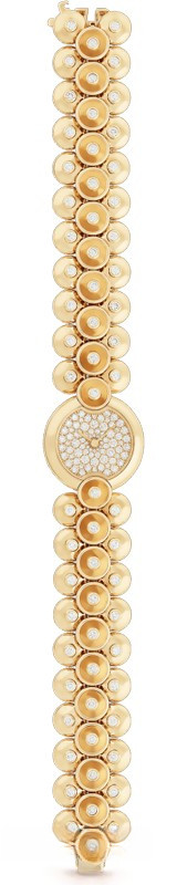 Высокая мода и Высокое ювелирное искусство создают удивительный союз, в котором сплетаются воедино мастерство, изящность форм и элеганстность линий. Часы Bouton d'or®, модель среднего размера. Корпус из желтого золота диаметром 20 мм; безель из желтого золота; циферблат из желтого золота с бриллиантами круглой огранки; браслет из желтого золота; бриллианты круглой огранки; бриллианты цвета DEF, чистоты VVS; кварцевый механизм. В основе коллекции Bouton d’or, пронизанной радостью и гармонией, — изогнутые линии ювелирного мотива Paillette, созданного в 1930-х годах. Современные модели можно сочетать с другими украшениями, подбирая к ним колье, кольца, серьги и часы по Вашему выбору.