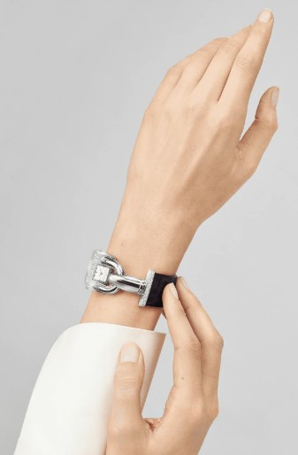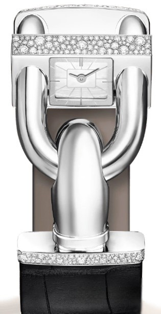 Смелые часы Cadenas® сегодня смотрятся так же современно, как и в 1935 году, когда Дом Van Cleef & Arpels впервые представил их публике. Их конструкция с наклонным циферблатом позволяет проверять время незаметно для окружающих, а строгие линии корпуса гармонично сочетаются с изгибами замка. Часы Cadenas. Корпус из белого золота 14 x 26 мм с круглыми бриллиантами «снежной» закрепки; безель из белого золота; циферблат из белого перламутра; заводная головка из белого золота; черный ремешок из матовой кожи аллигатора, застежка из белого золота; бриллианты цвета DEF, чистоты – от IF до VVS; кварцевый механизм.