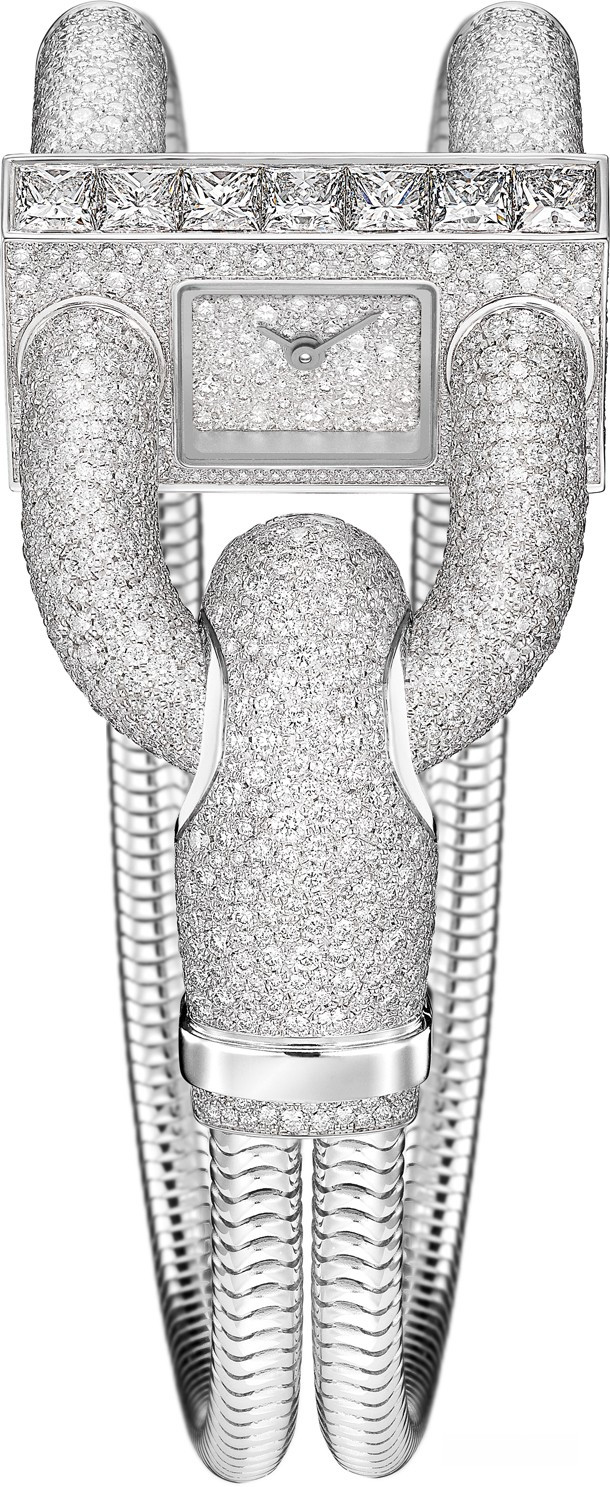 Верхняя часть корпуса украшена бриллиантами огранки «принцесса», а круглые бриллианты «снежного» паве наполняют восхитительным сиянием корпус, застежку и циферблат. Эти часы — неповторимое воплощение изящества, нежности и утонченности. Браслет в виде цепочки-змейки из белого золота выгодно оттеняет бриллиантовое сияние модели. Часы Cadenas Pavée с браслетом из золота: белое золото, бриллианты, кварцевый механизм.