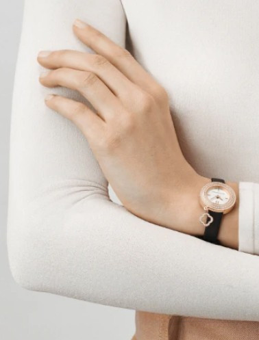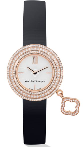 Коллекция изысканных часов Charms стала одним из символов Van Cleef & Arpels. Круглые корпуса этих часов украшены подвижными подвесками, покачивающимися в такт движению запястья. Модели, выполненные из золота разных оттенков, свидетельствуют о высоком мастерстве ювелирного Дома. Часы Charms, 25 мм. Корпус из розового золота диаметром 25 мм; безель из розового золота с тремя рядами бриллиантов; вращающаяся мини-подвеска из розового золота с бриллиантами круглой огранки; лакированный циферблат кремового цвета с мотивом Alhambra; заводная головка из розового золота с бриллиантом круглой огранки; сменные ремешки из черного атласа с классической застежкой из розового золота с бриллиантами круглой огранки и из белого атласа с классической застежкой из розового золота; бриллианты цвета DEF, чистоты – от IF до VSS; кварцевый механизм.