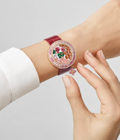 Часы Van Cleef & Arpels, навеянные образами флоры и фауны, воздают должное удивительной щедрости вечно обновляющейся природы. Течение времени гармонично вписывается в бесконечную череду времен года. Коллекция Extraordinary Dials, часы Charms Extraordinaire Amour. Корпус из розового золота диаметром 38 мм; безель из розового золота с бриллиантами круглой огранки и розовыми сапфирами круглой огранки. Вращающаяся мини-подвеска из розового золота в виде лакфиоли с розовыми сапфирами круглой огранки и гранатами-спессартитами круглой огранки. Циферблат с окрашенным перламутром на заднем плане, изображение кувшинок в технике миниатюрной живописи, изображение цикламены в технике миниатюрной живописи на заднем плане, изображение цикламены в технике миниатюрной живописи по резному перламутру на переднем плане, бутон цикламены из розового сапфира грушевидной огранки, изображение стеблей цикламены в технике миниатюрной живописи, изображение незабудки в технике миниатюрной живописи по резному перламутру с тычинками из желтого золота, желтыми сапфирами круглой огранки, лакфиоли из розового золота, эмаль cabochonné. Заводная головка из розового золота, бриллиант круглой огранки. Два сменных ремешка: темный винно-красный ремешок из блестящей кожи с бриллиантами круглой огранки и винно-красный ремешок из блестящей кожи аллигатора. Классическая застежка из розового золота. Бриллианты цвета DEF, чистоты – от IF до VVS. Кварцевый механизм. Пронумерованная серия. Циферблат часов Charms Extraordinaire Amour в корпусе из розового золота диаметром 38 мм украшен изображением лакфиолей, незабудок и цикламен. Этот цветочный букет – изысканная комбинация воспоминаний, красоты и крепких чувств – символизирует прочность любовных уз. Часы Charms Extraordinaire Amour – завершающая часть трилогии, посвященной всем этапам истории любви. В этой коллекции, ведущей повествование на языке цветов, Van Cleef & Arpels вновь предлагает романтическое толкование таких популярных сюжетов, как Природа, Любовь и Цветы.