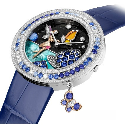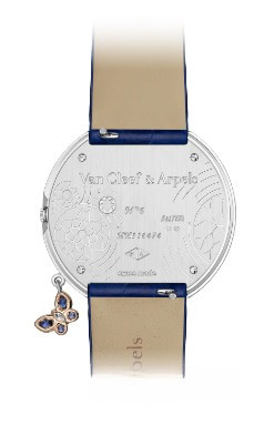 Часы Van Cleef & Arpels Charms Papillon Feerique представлены в корпусе из белого золота 18к размером 38 мм водонепроницаемостью 30 метров. Внутри корпуса находится кварцевый мехнизм. На циферблате с белыми бриллиантами и синими сапфирами отображаются часы, минуты. Часы поставляются на ремешке из кожи аллигатора с золотой застежкой. Безель из белых бриллиантов и синих сапфиров.