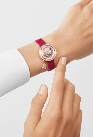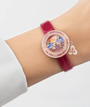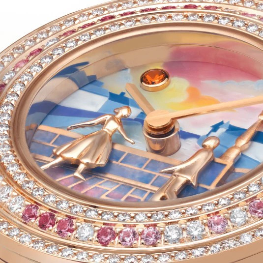 Появившийся благодаря союзу двух сердец Дом Van Cleef & Arpels всегда воспевал прекрасные истории любви. Эта традиция находит воплощение и в часах, на циферблатах которых оживает сказка. Коллекция Extraordinary Dials, часы Charms Romance Parisienne Rencontre. Корпус из розового золота диаметром 25 мм; безель из розового золота с бриллиантами и розовыми сапфирами круглой огранки; вращающаяся мини-подвеска из розового золота с бриллиантами и розовыми сапфирами круглой огранки; изображение неба и зданий в технике миниатюрной живописи по белому перламутру, солнце из розового золота с гранатами-спессартитами, мост из розового золота с выемчатой эмалью, фигурки из розового золота; заводная головка из розового золота с бриллиантом круглой огранки; два сменных ремешка из блестящей кожи аллигатора цвета фуксии и блестящей белой кожи аллигатора; сменная классическая застежка из розового золота с бриллиантами круглой огранки; бриллианты цвета DEF, чистоты – от IF до VVS; кварцевый механизм; пронумерованная серия. В коллекции Charms Romance Parisienne Дом Van Cleef & Arpels предлагает новый взгляд на три стадии любви, представленные на фоне видов Парижа, самого романтичного города в мире. Часы Charms Romance Parisienne Rencontre знакомят с первой частью любовной трилогии. В лучах заходящего солнца влюбленные впервые встречаются взглядами на Мосту Искусств.