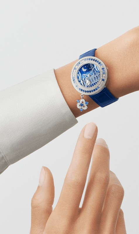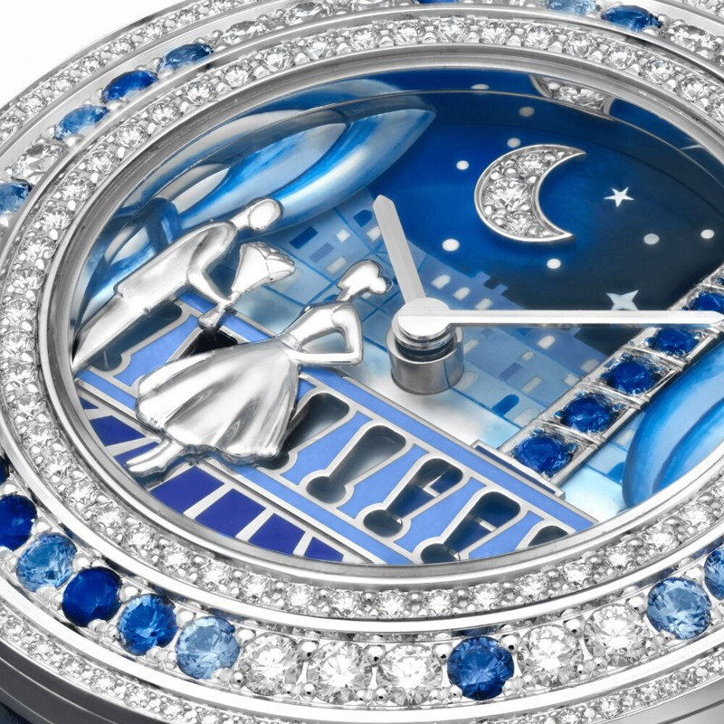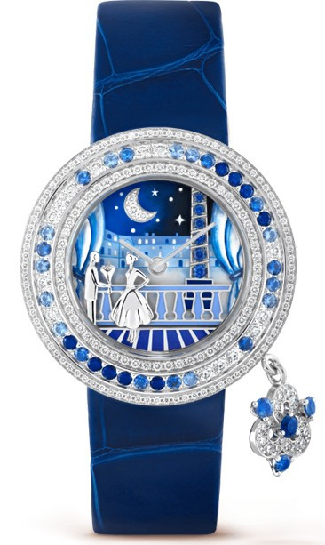 Появившийся благодаря союзу двух сердец Дом Van Cleef & Arpels всегда воспевал прекрасные истории любви. Эта традиция находит воплощение и в часах, на циферблатах которых оживает сказка. Коллекция Extraordinary Dials, часы Charms Romance Parisienne Retrouvailles. Корпус из белого золота диаметром 32 мм; безель из белого золота с бриллиантами и сапфирами круглой огранки; вращающаяся мини-подвеска из белого золота с бриллиантами и сапфирами круглой огранки; изображение неба, зданий и звезд в технике миниатюрной живописи по белому перламутру, луна из белого золота с бриллиантами круглой огранки, Вандомская колонна из белого золота с сапфирами круглой огранки, занавески в технике миниатюрной живописи по белому резному перламутру, балкон из белого золота с выемчатой эмалью, фигурки из белого золота; заводная головка из белого золота с бриллиантом круглой огранки; два сменных ремешка из блестящей синей кожи аллигатора и блестящей белой кожи аллигатора; сменная классическая застежка из белого золота с бриллиантами круглой огранки; бриллианты цвета DEF, чистоты – от IF до VVS; кварцевый механизм; пронумерованная серия. В коллекции Charms Romance Parisienne Дом Van Cleef & Arpels предлагает новый взгляд на три стадии любви, представленные на фоне видов Парижа, самого романтичного города в мире. Часы Charms Romance Parisienne Retrouvailles знакомят со второй частью любовной трилогии. Влюбленная пара встречается вечером на Вандомской площади. В лунном свете юноша преподносит своей возлюбленной букет цветов в знак все возрастающего чувства.