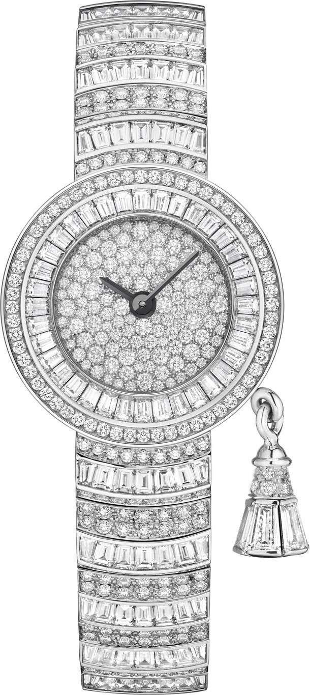 Часы Sweet Charms Pavée с бриллиантовым браслетом. Корпус из белого золота диаметром 21 мм, круглые бриллианты по корпусу, безель с круглыми бриллиантами и бриллиантами багетной огранки. Циферблат из белого золота, украшенный круглыми бриллиантами в технике serti neige. Сменный браслет из белого золота, украшенный круглыми бриллиантами и бриллиантами. багетной огранки, сменный ремешок из черного атласа, съемная подвеска из белого золота с бриллиантами в технике serti neige. Заводная головка из белого золота с круглыми бриллиантами и бриллиантами багетной огранки. Кварцевый механизм. Постоянная коллекция.