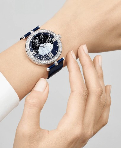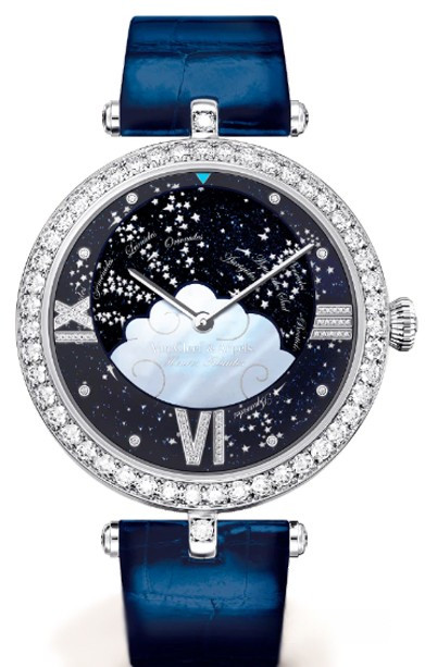 Часы Poetic Complications™, в которых традиции мастерства объединяются с техническими достижениями, превращают отсчет времени в увлекательное повествование. Их филигранно выполненные механизмы выражают творческий подход мастеров Van Cleef & Arpels. Коллекция Poetic Complications, часы Lady Arpels Heures Filantes. Корпус из белого золота диаметром 38 мм, безель из белого золота с бриллиантами круглой огранки; вращающийся циферблат из авантюрина, передний план из белого перламутра, сапфировое стекло, белое золото и бриллианты круглой огранки. Заводная головка из белого золота, бриллиант круглой огранки. Задняя крышка из сапфирового стекла. Темно-синий ремешок из блестящей кожи аллигатора; классическая застежка из белого золота с бриллиантами круглой огранки. Бриллианты цвета DEF, чистоты – от IF до VVS. Механизм с ручным подзаводом (Valfleurier P968) и модулем Agenhor с сезонным календарем, специально разработанным для Van Cleef & Arpels, 40-часовой запас хода. Пронумерованная серия. Дюжина падающих звезд на небосклоне циферблата кружится вокруг облака из перламутра в едва уловимом ритме, задаваемом механизмом с сезонным календарем. Окошко на обратной стороне часов указывает в режиме реального времени, сколько заветных желаний можно сейчас загадать, принимая во внимание интенсивность звездного дождя.