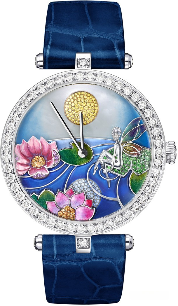 Часы Lady Arpels Jour Nuit Fée Ondine. Корпус из белого золота диаметром 38 мм, бриллианты, безель с бриллиантами, заводная головка с бриллиантом. Циферблат: перламутр, бриллианты, желтые и розовые сапфиры, спессартины и цавориты, миниатюрная роспись, техника эмали plique-à-jour и champlevé. Задняя крышка корпуса: белое золото, бриллианты, гравировка, повторяющая тему изображения на циферблате, сапфировое стекло, сквозь которое виден ротор. Механизм с автоматическим подзаводом, 24-часовой модуль, разработанный эксклюзивно для Van Cleef & Arpels, запас хода — 60 часов. Лаковый ремешок из кожи аллигатора синего цвета, застежка из белого золота с бриллиантами. Постоянная коллекция, лимитировано производством. Взгляду наблюдателя предстает поистине сказочная картина: солнце и луна сменяют друг друга, задавая ритм дня прекрасной нимфы. Ее грациозная фигурка, напоминающая женские образы Van Cleef & Arpels 1940-х годов, расположилась на листе водной лилии. С рассвета и до заката красавицу освещает солнце, а ночью его сменяет завораживающее сияние полной луны, и все это благодаря вращающемуся диску циферблата, который совершает полный оборот за 24 часа.