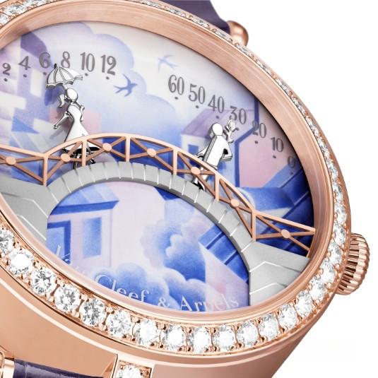 Появившийся благодаря союзу двух сердец Дом Van Cleef & Arpels всегда воспевал прекрасные истории любви. Эта традиция находит воплощение и в часах, на циферблатах которых оживает сказка. Коллекция Poetic Complications, часы Lady Arpels Pont des Amoureux Jour. Корпус из розового золота диаметром 38 мм; безель из розового золота с бриллиантами круглой огранки; циферблат из цветной эмали, выполненной в технике гризайль, рельефный мост из белого и розового золота; заводная головка из розового золота с бриллиантом круглой огранки; сменный ремешок из глянцевой кожи аллигатора темно-лилового цвета со сменной классической застежкой из розового золота с бриллиантами круглой огранки; бриллианты цвета DEF, чистоты – от IF до VVS; механизм с автоматическим подзаводом (Valfleurier Q020) с запускающимся по запросу анимированным модулем с ретроградной индикацией, разработанным эксклюзивно для Van Cleef & Arpels; 36-часовой запас хода; пронумерованная серия Часы представлены с двумя сменными браслетами и сменной классической застежкой с бриллиантами. Двое влюбленных, окрыленные нежными чувствами, спешат на свидание к мосту Искусств в Париже. Каждый их шаг навстречу друг другу отсчитывает часы и минуты ретроградного механизма. Нежный поцелуй при встрече в полдень и в полночь обещает, что каждый следующий день будет наполнен любовью.