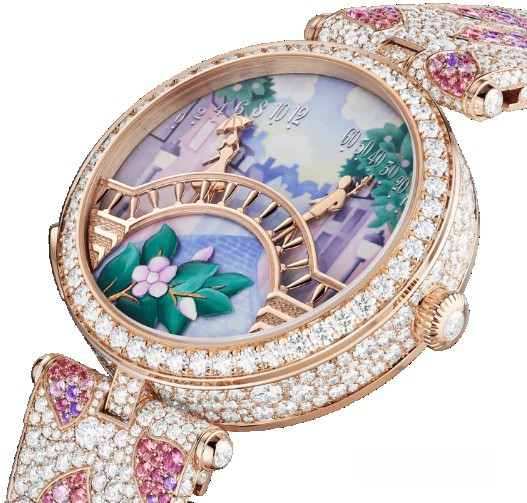 Появившийся благодаря союзу двух сердец Дом Van Cleef & Arpels всегда воспевал прекрасные истории любви. Эта традиция находит воплощение и в часах, на циферблатах которых оживает сказка. Коллекция Poetic Complications, часы Lady Arpels Pont des Amoureux Printemps. Корпус из розового золота диаметром 38 мм с бриллиантами круглой огранки; безель из розового золота с бриллиантами круглой огранки; циферблат из цветной эмали, выполненной в технике гризайль; рельефный мост из розового золота; рельефные цветы и листья из желтого золота; миниатюрная роспись; заводная головка из розового золота с бриллиантом круглой огранки; браслет из розового золота с бриллиантами и розовыми, сиреневыми и лиловыми сапфирами круглой огранки; застежка из розового золота; бриллианты цвета DEF, чистоты – от IF до VVS; механизм с автоматическим подзаводом (Valfleurier Q020) с запускающимся по запросу анимированным модулем с ретроградной индикацией, разработанным эксклюзивно для Van Cleef & Arpels; 36-часовой запас хода; пронумерованная серия. Двое влюбленных, окрыленные нежными чувствами, спешат на свидание к мосту Искусств в Париже. Каждый их шаг навстречу друг другу отсчитывает часы и минуты ретроградного механизма. Нежный поцелуй при встрече в полдень и в полночь обещает, что каждый следующий день будет наполнен любовью.