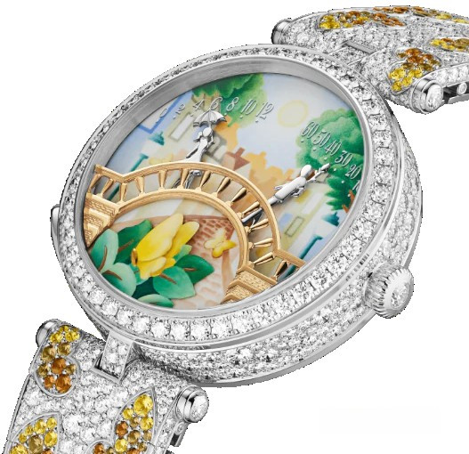 Появившийся благодаря союзу двух сердец Дом Van Cleef & Arpels всегда воспевал прекрасные истории любви. Эта традиция находит воплощение и в часах, на циферблатах которых оживает сказка. Коллекция Poetic Complications, часы Lady Arpels Pont des Amoureux Été. Корпус из белого золота диаметром 38 мм с бриллиантами круглой огранки; безель из белого золота с бриллиантами круглой огранки; циферблат из цветной эмали, выполненной в технике гризайль; рельефный мост из желтого золота; рельефные бабочка и листья из желтого золота; миниатюрная роспись; заводная головка из белого золота с бриллиантом круглой огранки; браслет из белого золота с бриллиантами, желтыми сапфирами и спессартитами круглой огранки; застежка из белого золота; бриллианты цвета DEF, чистоты – от IF до VVS; механизм с автоматическим подзаводом (Valfleurier Q020) с запускающимся по запросу анимированным модулем с ретроградной индикацией, разработанным эксклюзивно для Van Cleef & Arpels; 36-часовой запас хода; пронумерованная серия. Влюбленная пара, исполненная нежных и романтичных чувств, одним прекрасным летним днем назначает свидание на парижском мосту. Отсчитывая минуты и часы с помощью ретроградного механизма, фигурки неуклонно сближаются для поцелуя. Каждое их объятие – это гимн любви.