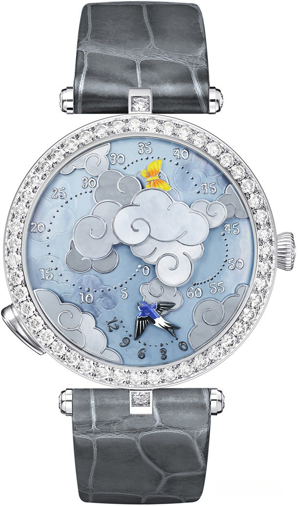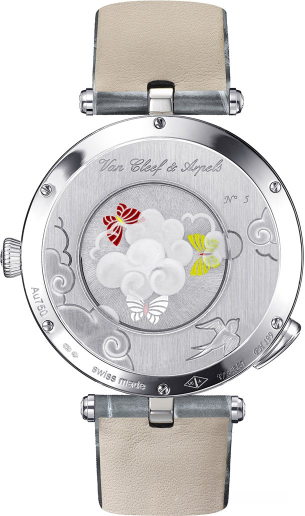 Часы Lady Arpels Ronde des Papillons. Корпус из белого золота диаметром 38 мм, безель c бриллиантами, заводная головка с одним бриллиантом. Циферблат: перламутр, гравировка по золоту, миниатюрная роспись. Задняя крышка: белое золото с гравировкой, повторяющей сюжет на циферблате, гравированное окошко из сапфирового стекла, видимый ротор с отделкой. Механический калибр с автоматическим подзаводом, прыгающим ретроградным счетчиком часов, минутным счетчиком с переменной скоростью и анимацией по запросу, разработанной специально для Van Cleef & Arpels, запас хода — 40 часов. Дом Van Cleef & Arpels подал патентную заявку на механизм анимации этих часов. Лаковый ремешок из кожи аллигатора серого цвета, классическая застежка из белого золота с бриллиантами. Постоянная коллекция, лимитировано производством.