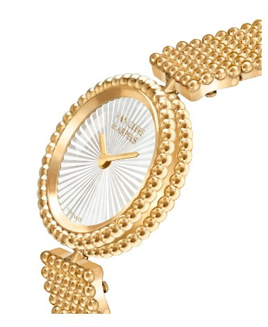 Часы Van Cleef & Arpels Perlee Quartz 23 mm представлены в корпусе из желтого золота 18к размером 23 мм водонепроницаемостью 30 метров. Внутри корпуса находится кварцевый мехнизм. На белом жемчужном гильошированном циферблате отображаются часы, минуты. Часы поставляются на золотом браслете.