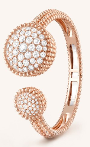 Женственные модели Perlée™ украшены изящными золотыми бусинками. Кольца, колье, браслеты, серьги и часы с графическим дизайном, объединенные в бесконечном множестве комбинаций, позволяют подчеркнуть индивидуальный стиль. Потайные часы Perlée, модель среднего размера. Корпус из розового золота диаметром 25 мм; безель из розового золота с бриллиантами круглой огранки; белый перламутровый циферблат; браслет из розового золота с бриллиантами; кварцевый механизм. Размер запястья: 16 см.