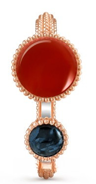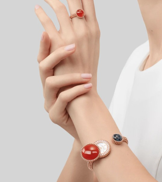 Часы Van Cleef & Arpels Perlee Toi & Moi Secret Medium представлены в корпусе из желтого золота 18к размером 25 мм водонепроницаемостью 30 метров. Внутри корпуса находится кварцевый мехнизм. На белом жемчужном циферблате отображаются часы, минуты. Часы поставляются на золотом браслете. Безель из белых бриллиантов, питерсит, сердолик.