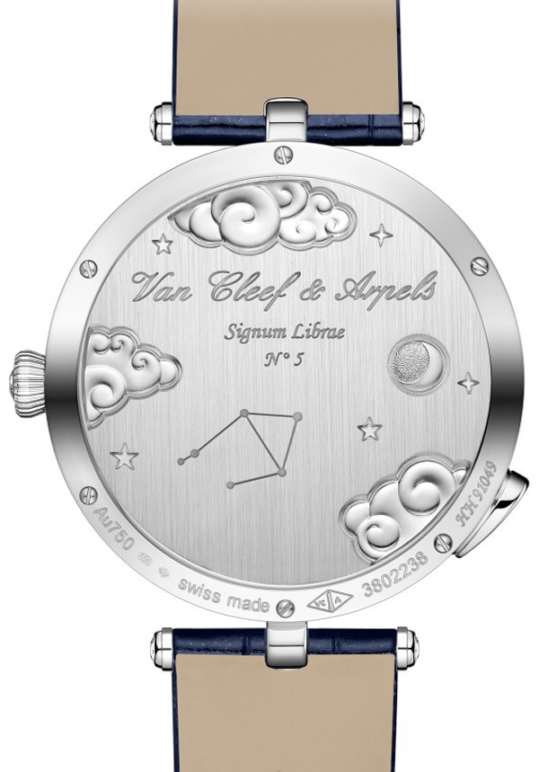 Часы Van Cleef & Arpels Lady Arpels Zodiac Lumineux представлены в корпусе размером 38 х 13.8 мм из белого золота 18к, водонепроницаемость 30 метров. На циферблате синяя эмаль с золотым орнаментом и вкраплениями из цветной эмали, люминесцентные точки на местах часовых маркеров. Ремешок из кожи аллигатора с вставкой из белого золота 18к. Механизм автоматический, Калибр Valfleurier Q020, функции: часы, минуты, пьезоэлектрические лампочки; запас хода 36 часов, балансовая частота 4Гц, 43 камня. Нажатие кнопки в нижней левой части корпуса активирует подсветку созвездий. Безель из белых бриллиантов.