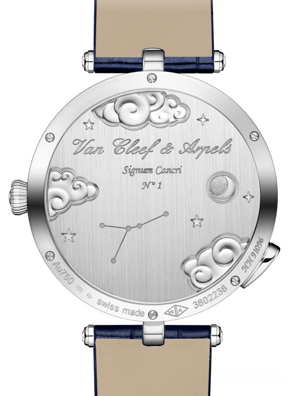 Часы Van Cleef & Arpels Lady Arpels Zodiac Lumineux представлены в корпусе размером 38 х 13.8 мм из белого золота 18к, водонепроницаемость 30 метров. На циферблате синяя эмаль с золотым орнаментом и вкраплениями из цветной эмали, люминесцентные точки на местах часовых маркеров. Ремешок из кожи аллигатора с вставкой из белого золота 18к. Механизм автоматический, Калибр Valfleurier Q020, функции: часы, минуты, пьезоэлектрические лампочки; запас хода 36 часов, балансовая частота 4Гц, 43 камня. Нажатие кнопки в нижней левой части корпуса активирует подсветку созвездий. Безель из белых бриллиантов.