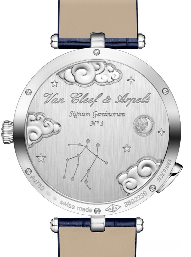 Часы Van Cleef & Arpels Lady Arpels Zodiac Lumineux представлены в корпусе размером 38 х 13.8 мм из белого золота 18к, водонепроницаемость 30 метров. На циферблате синяя эмаль с золотым орнаментом и вкраплениями из цветной эмали, люминесцентные точки на местах часовых маркеров. Ремешок из кожи аллигатора с вставкой из белого золота 18к. Механизм автоматический, Калибр Valfleurier Q020, функции: часы, минуты, пьезоэлектрические лампочки; запас хода 36 часов, балансовая частота 4Гц, 43 камня. Нажатие кнопки в нижней левой части корпуса активирует подсветку созвездий. Безель из белых бриллиантов.