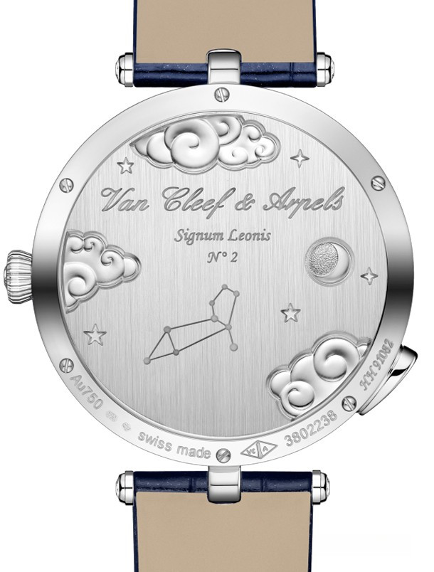 Часы Van Cleef & Arpels Lady Arpels Zodiac Lumineux представлены в корпусе размером 38 х 13.8 мм из белого золота 18к, водонепроницаемость 30 метров. На циферблате синяя эмаль с золотым орнаментом и вкраплениями из цветной эмали, люминесцентные точки на местах часовых маркеров. Ремешок из кожи аллигатора с вставкой из белого золота 18к. Механизм автоматический, Калибр Valfleurier Q020, функции: часы, минуты, пьезоэлектрические лампочки; запас хода 36 часов, балансовая частота 4Гц, 43 камня. Нажатие кнопки в нижней левой части корпуса активирует подсветку созвездий. Безель из белых бриллиантов.