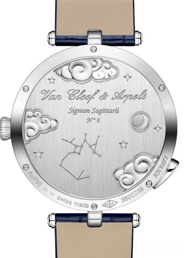 Часы Van Cleef & Arpels Lady Arpels Zodiac Lumineux представлены в корпусе размером 38 х 13.8 мм из белого золота 18к, водонепроницаемость 30 метров. На циферблате синяя эмаль с золотым орнаментом и вкраплениями из цветной эмали, люминесцентные точки на местах часовых маркеров. Ремешок из кожи аллигатора с вставкой из белого золота 18к. Механизм автоматический, Калибр Valfleurier Q020, функции: часы, минуты, пьезоэлектрические лампочки; запас хода 36 часов, балансовая частота 4Гц, 43 камня. Нажатие кнопки в нижней левой части корпуса активирует подсветку созвездий. Безель из белых бриллиантов.