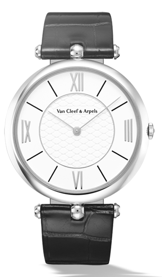 Часы, созданные в 1949 году Пьером Арпельсом, носят его имя и олицетворяют мужскую элегантность Van Cleef & Arpels. Модель, сочетающая изысканность и сдержанность, отличается тонким корпусом с двумя центральными креплениями. Часы Pierre Arpels, 38 мм. Корпус из белого золота диаметром 38 мм; безель из белого золота; белый лакированный циферблат с узором «соты»; заводная головка из белого золота с бриллиантом круглой огранки; темно-серый ремешок из блестящей кожи аллигатора, классическая застежка из белого золота с фирменным клеймом; бриллианты цвета DEF, чистоты – от IF до VVS; механизм с ручным подзаводом (830P), 60-часовой запас хода.