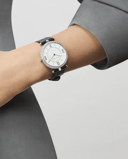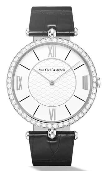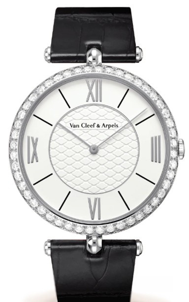 Часы, созданные в 1949 году Пьером Арпельсом, носят его имя и олицетворяют мужскую элегантность Van Cleef & Arpels. Модель, сочетающая изысканность и сдержанность, отличается тонким корпусом с двумя центральными креплениями. Часы Pierre Arpels, 38 мм. Корпус из белого золота диаметром 38 мм; безель из белого золота с бриллиантами круглой огранки; белый лакированный циферблат с узором «соты»; заводная головка из белого золота с бриллиантом круглой огранки; черный ремешок из блестящей кожи аллигатора, классическая застежка из белого золота с фирменным клеймом и бриллиантами круглой огранки; бриллианты цвета DEF, чистоты – от IF до VSS; механизм с ручным подзаводом (830P), 60-часовой запас хода.