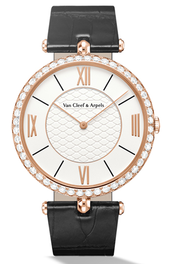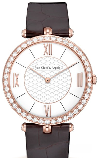 Часы, созданные в 1949 году Пьером Арпельсом, носят его имя и олицетворяют мужскую элегантность Van Cleef & Arpels. Модель, сочетающая изысканность и сдержанность, отличается тонким корпусом с двумя центральными креплениями. Часы Pierre Arpels, 38 мм. Корпус из розового золота диаметром 38 мм; безель из розового золота с бриллиантами круглой огранки; белый лакированный циферблат с узором «соты»; заводная головка из розового золота с бриллиантом; темно-коричневый ремешок из блестящей кожи аллигатора, классическая застежка из розового золота с фирменным клеймом; бриллианты цвета DEF, чистоты – от IF до VSS; механизм с ручным подзаводом (830P), 60-часовой запас хода.