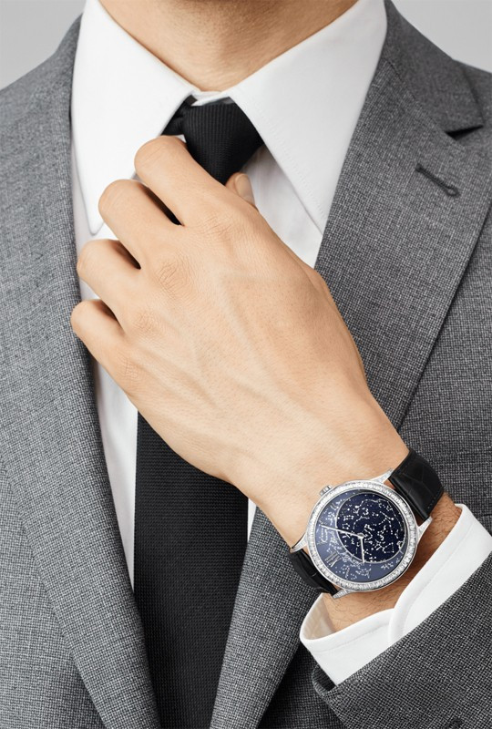 Часы Poetic Complications™, в которых традиции мастерства объединяются с техническими достижениями, превращают отсчет времени в увлекательное повествование. Их филигранно выполненные механизмы выражают творческий подход мастеров Van Cleef & Arpels. Коллекция Poetic Complications, часы Midnight in Paris. Корпус из белого золота диаметром 41 мм; безель из белого золота; бриллианты багетной огранки, вращающийся циферблат из авантюрина, передний план из матового синего кварца. Заводная головка из белого золота, задняя крышка в офицерском стиле. Черный ремешок из матовой кожи аллигатора; классическая застежка из белого золота с бриллиантами круглой огранки. Бриллианты цвета DEF, чистоты – от IF до VVS. Механизм с ручным подзаводом JLC 849 и модулем Agenhor с сезонным календарем, специально разработанным для Van Cleef & Arpels, 30-часовой запас хода. Пронумерованная серия. Часы следуют один за другим на фоне парижского неба, приглашающего в мир прекрасных грез. Циферблат, достоверно воспроизводящий положение звезд над французской столицей, незаметно совершает полный оборот в течение года.