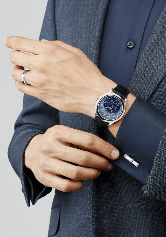 Часы Poetic Complications™, в которых традиции мастерства объединяются с техническими достижениями, превращают отсчет времени в увлекательное повествование. Их филигранно выполненные механизмы выражают творческий подход мастеров Van Cleef & Arpels. Коллекция Poetic Complications, часы Midnight in Paris. Корпус из белого золота диаметром 41 мм; безель из белого золота; вращающийся циферблат из авантюрина, передний план из матового синего кварца. Заводная головка из белого золота; задняя крышка в офицерском стиле. Черный ремешок из матовой кожи аллигатора; классическая застежка из белого золота. Механизм с ручным подзаводом (JLC 849) и модулем Agenhor с сезонным календарем, специально разработанным для Van Cleef & Arpels, 30-часовой запас хода. Пронумерованная серия. Часы следуют один за другим на фоне парижского неба, приглашающего в мир прекрасных грез. Циферблат, достоверно воспроизводящий положение звезд над французской столицей, незаметно совершает полный оборот в течение года.
