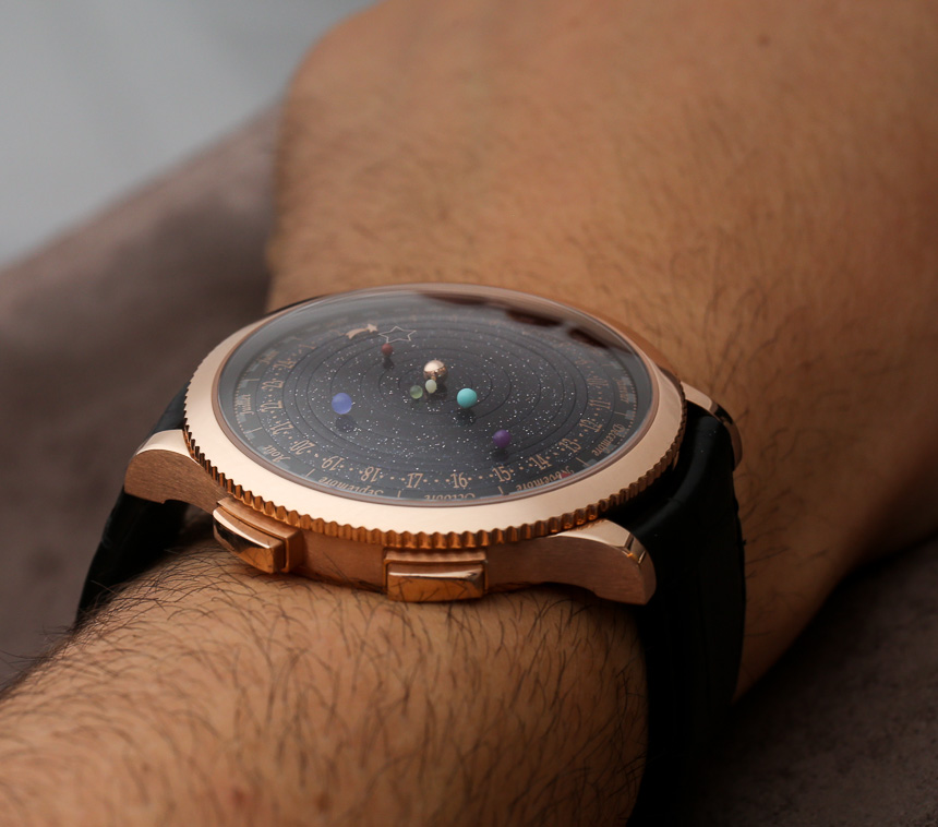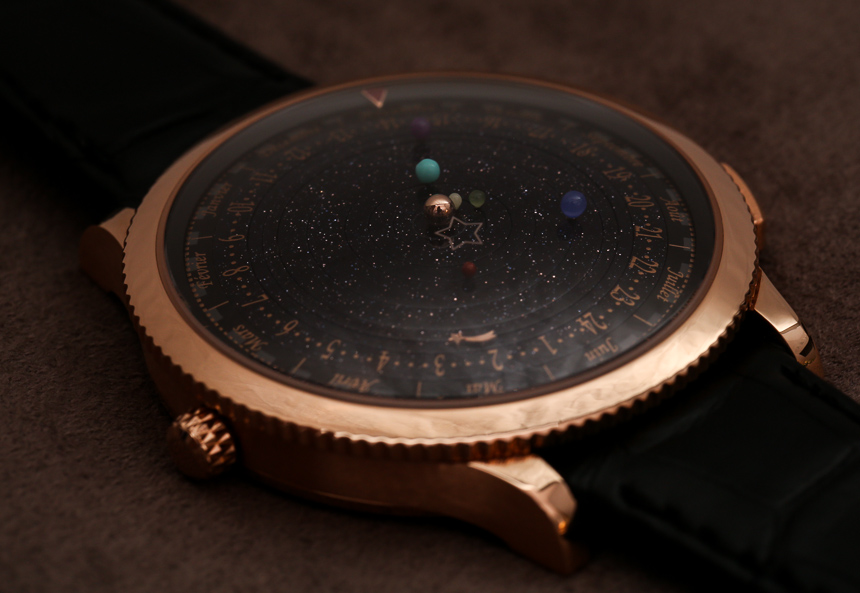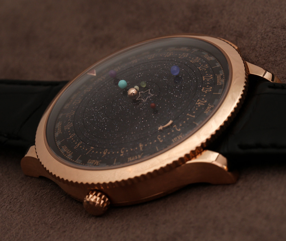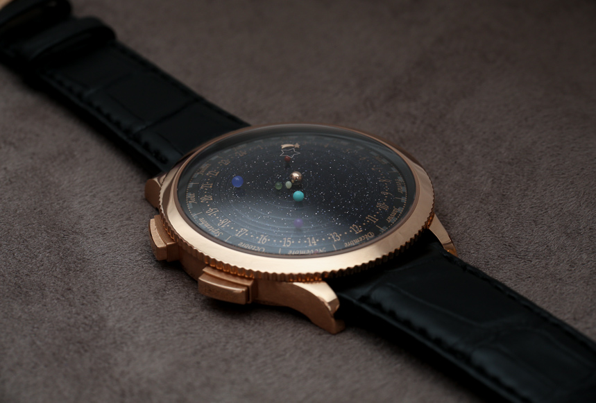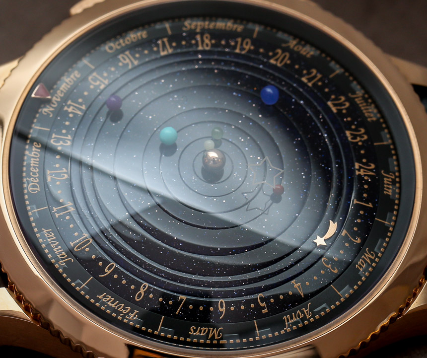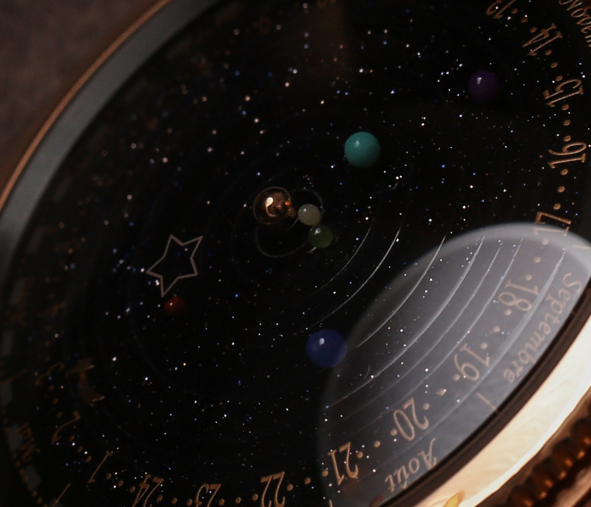 Часы Poetic Complications™, в которых традиции мастерства объединяются с техническими достижениями, превращают отсчет времени в увлекательное повествование. Их филигранно выполненные механизмы выражают творческий подход мастеров Van Cleef & Arpels. Коллекция Poetic Complications, часы Midnight Planétarium. Корпус из розового золота диаметром 44 мм. Безель из розового золота. Циферблат из авантюрина, Солнце и падающая звезда из розового золота, Меркурий из серпентина, Венера из хлоромеланита, Земля из бирюзы, Марс из красной яшмы, Юпитер из синего агата, Сатурн из сугилита. Заводная головка из розового золота, задняя крышка из сапфирового стекла. Черный ремешок из матовой кожи аллигатора, раскладывающаяся застежка из розового золота. Механизм с автоподзаводом (Stern Manufacture) и модулем планетария, разработанным Домом Van Cleef & Arpels при участии Christiaan Van der Klaauw, 48-часовой запас хода. Пронумерованная серия. Часы Midnight Planétarium демонстрируют движение планет во Вселенной. Воссозданную в подробностях картину дополняет падающая звезда, которая указывает время. Звезда сулит удачу и приглашает вписать свой счастливый день в хоровод небесных тел. Циферблат украшен миниатюрным изображением Солнца и пяти планет, различимых с Земли невооруженным глазом: Меркурия, Венеры, Марса, Юпитера и Сатурна. Благодаря специально разработанному модулю каждая из планет вращается на циферблате с той же скоростью, что и в космическом пространстве.
