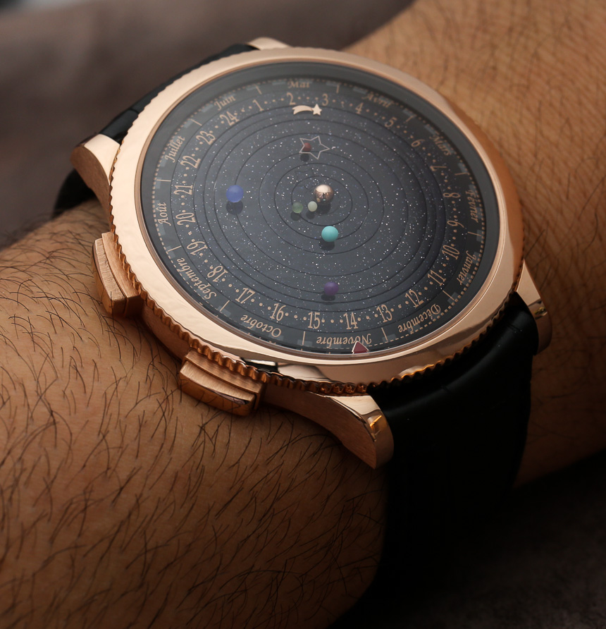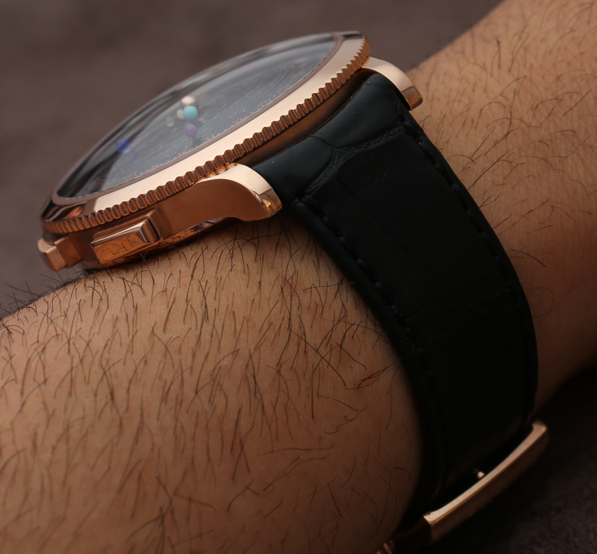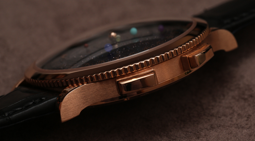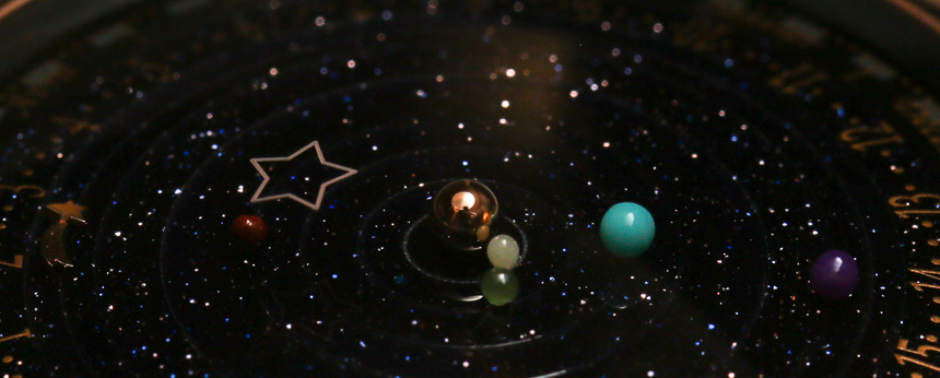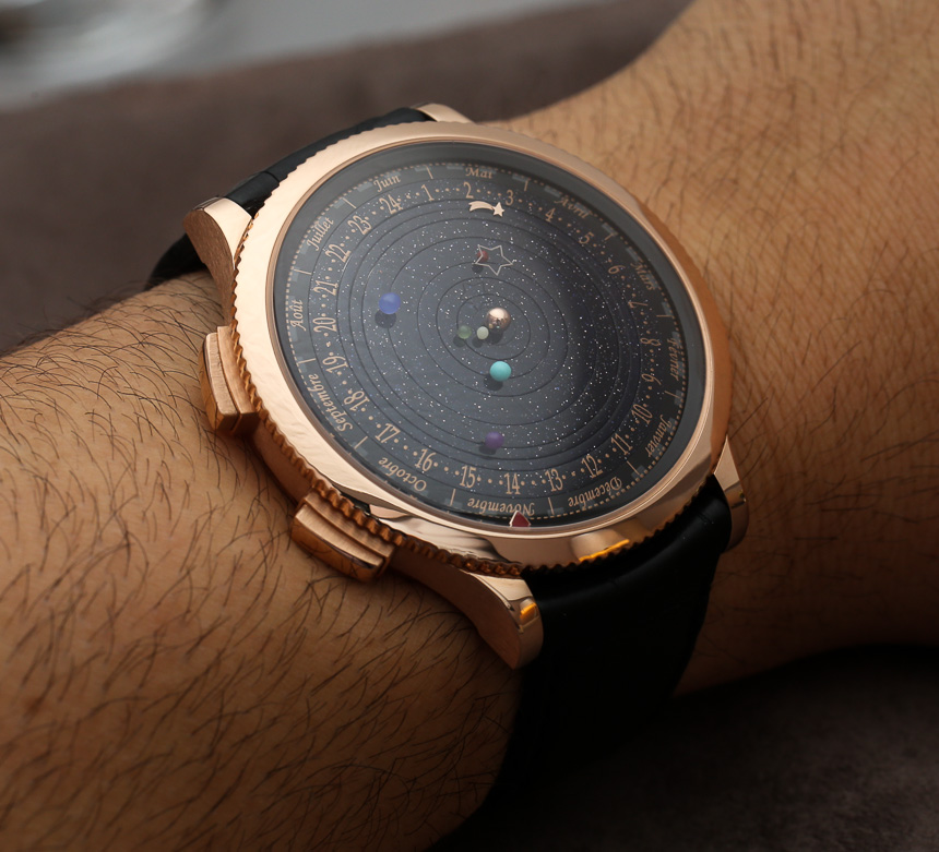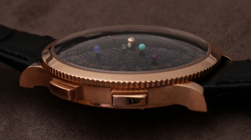 Часы Poetic Complications™, в которых традиции мастерства объединяются с техническими достижениями, превращают отсчет времени в увлекательное повествование. Их филигранно выполненные механизмы выражают творческий подход мастеров Van Cleef & Arpels. Коллекция Poetic Complications, часы Midnight Planétarium. Корпус из розового золота диаметром 44 мм. Безель из розового золота. Циферблат из авантюрина, Солнце и падающая звезда из розового золота, Меркурий из серпентина, Венера из хлоромеланита, Земля из бирюзы, Марс из красной яшмы, Юпитер из синего агата, Сатурн из сугилита. Заводная головка из розового золота, задняя крышка из сапфирового стекла. Черный ремешок из матовой кожи аллигатора, раскладывающаяся застежка из розового золота. Механизм с автоподзаводом (Stern Manufacture) и модулем планетария, разработанным Домом Van Cleef & Arpels при участии Christiaan Van der Klaauw, 48-часовой запас хода. Пронумерованная серия. Часы Midnight Planétarium демонстрируют движение планет во Вселенной. Воссозданную в подробностях картину дополняет падающая звезда, которая указывает время. Звезда сулит удачу и приглашает вписать свой счастливый день в хоровод небесных тел. Циферблат украшен миниатюрным изображением Солнца и пяти планет, различимых с Земли невооруженным глазом: Меркурия, Венеры, Марса, Юпитера и Сатурна. Благодаря специально разработанному модулю каждая из планет вращается на циферблате с той же скоростью, что и в космическом пространстве.