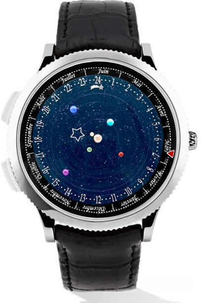 Часы Midnight Planetarium представлены в корпусе из белого золота 18к размером 44 мм. Водонепроницаемость корпуса 30 метров. На синем циферблате отображаются часы, минуты, месяц и планетарий. Механизм автоматический обладает запасом хода 48 часов. Часы комплектуются ремешком из кожи аллигатора с вставкой из белого золота 18к.