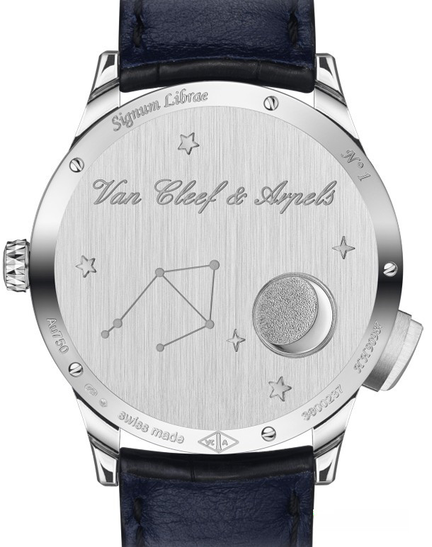 Часы Van Cleef & Arpels Midnight Zodiac Lumineux Poetic Complications представлены в корпусе диаметром 42 мм из белого золота 18к. На синем эмалевом циферблате отображаются часы, минуты, один из 12-ти знаков зодиака. Внутри корпуса установлен автоматический механизм с запасом хода 40 часов. Часы поставляются на синем ремешке из кожи аллигатора с вставкой из белого золота 18к. В часы встроен модуль подсветки циферблата.