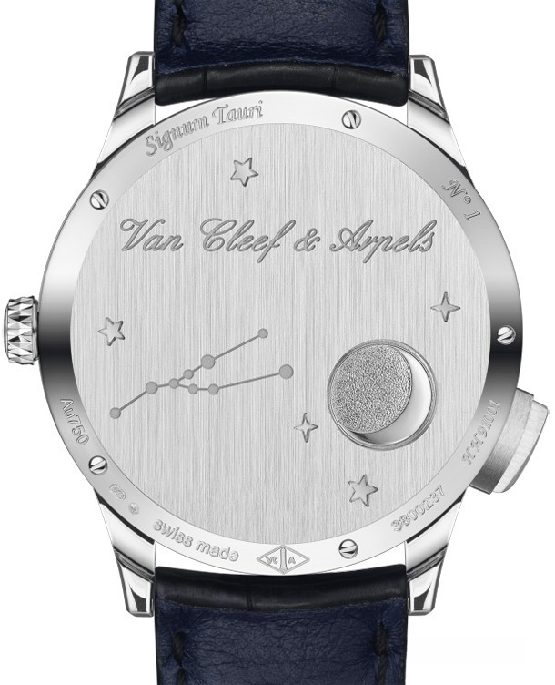 Часы Van Cleef & Arpels Midnight Zodiac Lumineux Poetic Complications представлены в корпусе диаметром 42 мм из белого золота 18к. На синем эмалевом циферблате отображаются часы, минуты, один из 12-ти знаков зодиака. Внутри корпуса установлен автоматический механизм с запасом хода 40 часов. Часы поставляются на синем ремешке из кожи аллигатора с вставкой из белого золота 18к. В часы встроен модуль подсветки циферблата.