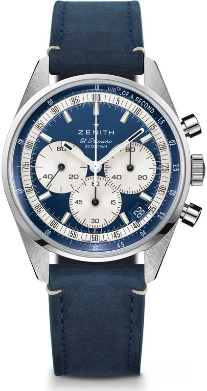 Часы Zenith El Primero Original с хронографом выпущены в круглом корпусе из нержавеющей стали 18к. Размер составляет 38 мм, водонепроницаемость 50 м. Внутри корпуса установлен автоматический механизм, Калибр El Primero 3600, обеспечивающий запас хода 60 часов. На синем с белым циферблате отображаются часы, минуты, секунды, дата, тахиметр. Часы комплектуются кожаным ремешком с вставкой из нержавеющей стали.