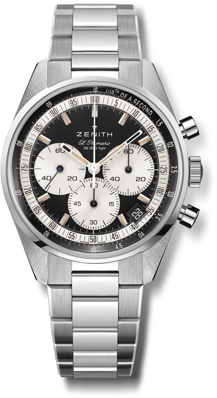 Часы Zenith Chronomaster El Primero 38 mm представлены в корпусе из нержавеющей стали размером 38 х 12.6 мм водонепроницаемостью 50 метров. Внутри корпуса находится автоматический механизм, Калибр El Primero 3600, обладающий запасом хода 60 часов. На черном с белым циферблате отображаются часы, минуты, секунды, дата, тахиметр. Часы поставляются на браслете из нержавеющей стали.