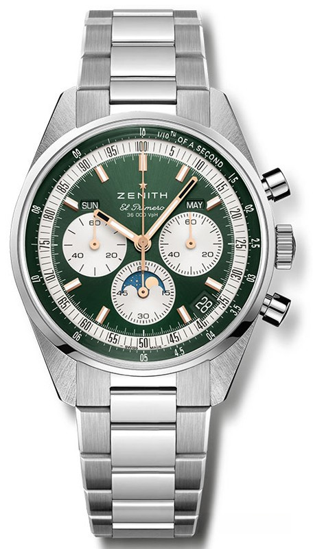 Часы Zenith Chronomaster Original 38 mm представлены в корпусе размером 38 x 13 мм из нержавеющей стали водонепроницаемостью 50 метров. Внутри корпуса установлен автоматический механизм, Калибр El Primero 3600, обладающий запасом хода 60 часов. На зеленом циферблате отображаются часы, минуты, секунды, дата, тахиметр, накопители хронографа. Часы поставляются на браслете из нержавеющей стали.