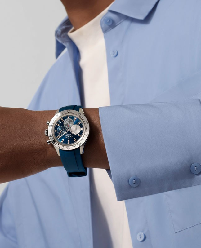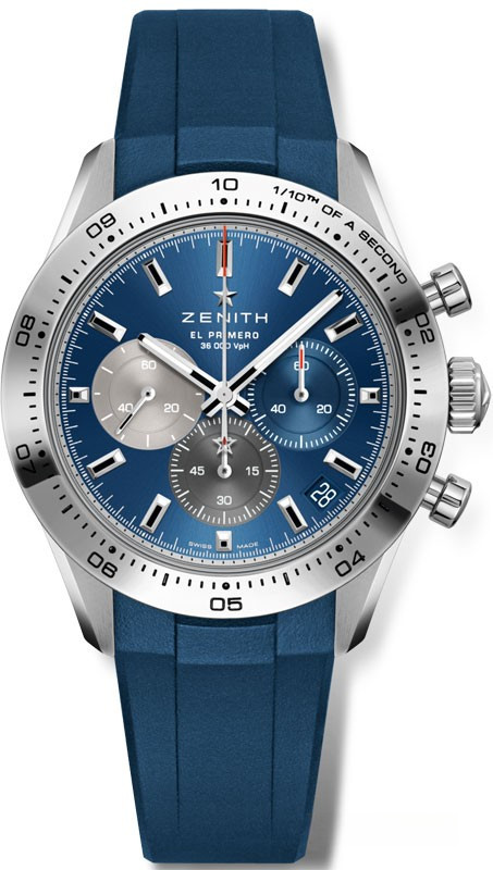 Часы Zenith Chronomaster Sport представлены в корпусе размером 41 х 13.8 мм из нержавеющей стали водонепроницаемостью 100 метров. Внутри корпуса установлен автоматический механизм, Калибр 3600, обладающий запасом хода 60 часов. На синем циферблате отображаются часы, минуты, секунды, дата, тахиметр. Часы поставляются на каучуковом ремешке с застежкой из нержавеющей стали.