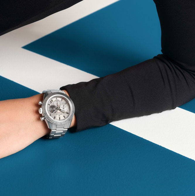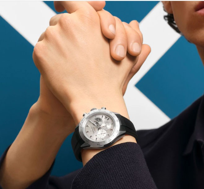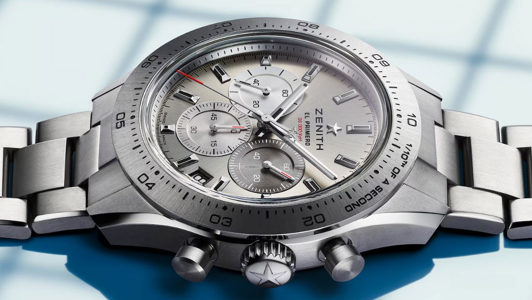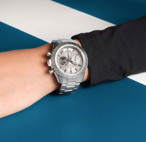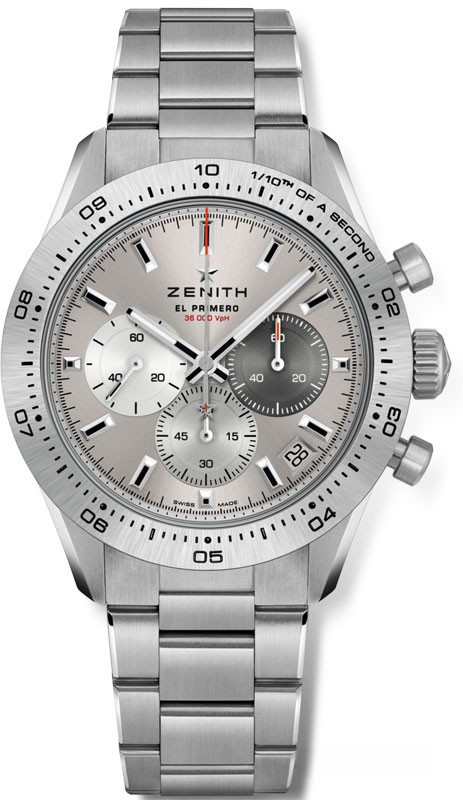 Часы Zenith Chronomaster Sport представлены в корпусе размером 41 х 13.8 мм из титана водонепроницаемостью 100 метров. Внутри корпуса установлен автоматический механизм, Калибр 3600, обладающий запасом хода 60 часов. На серебристом циферблате отображаются часы, минуты, секунды, дата, тахиметр. Часы поставляются на браслете из титана.